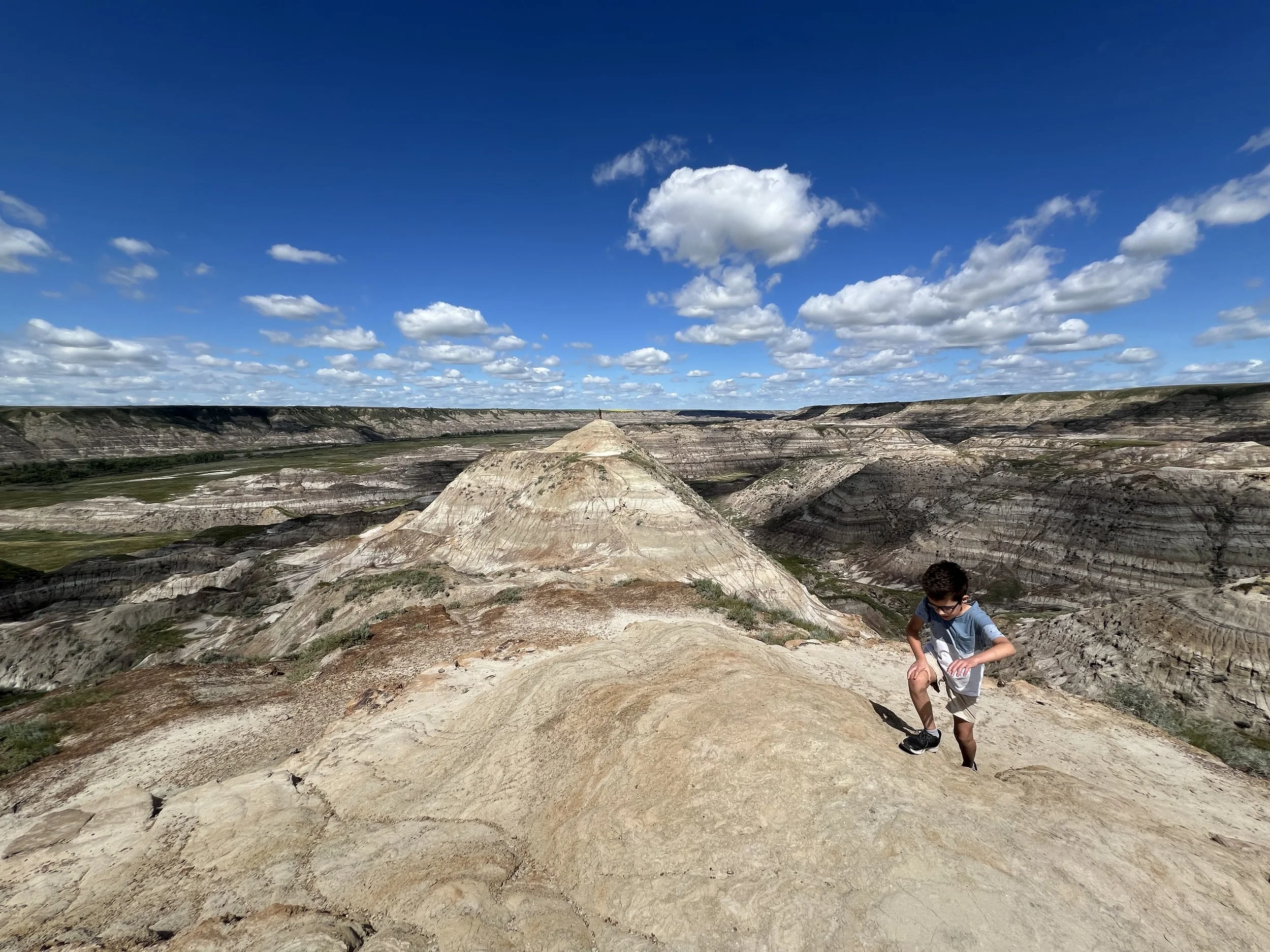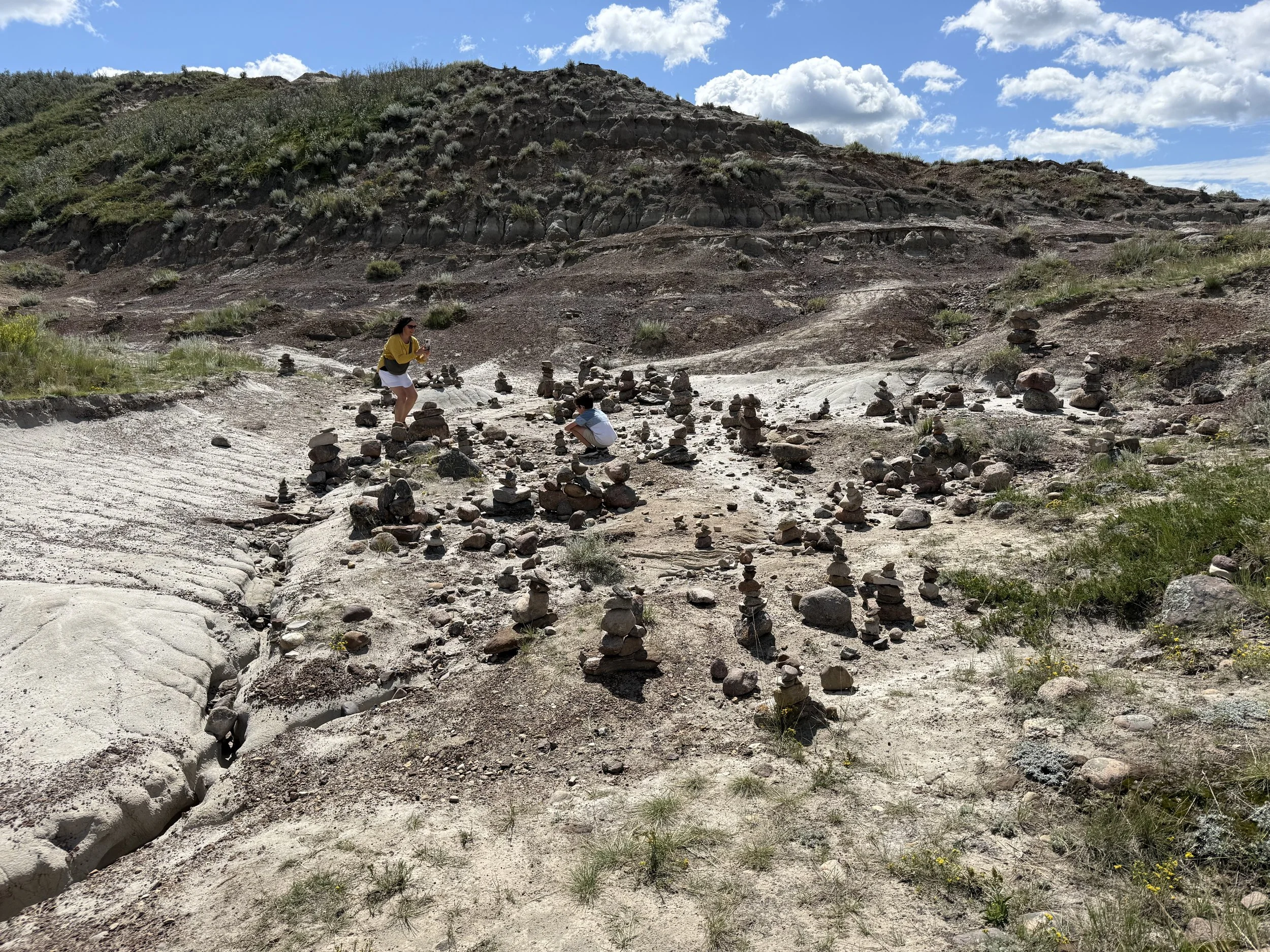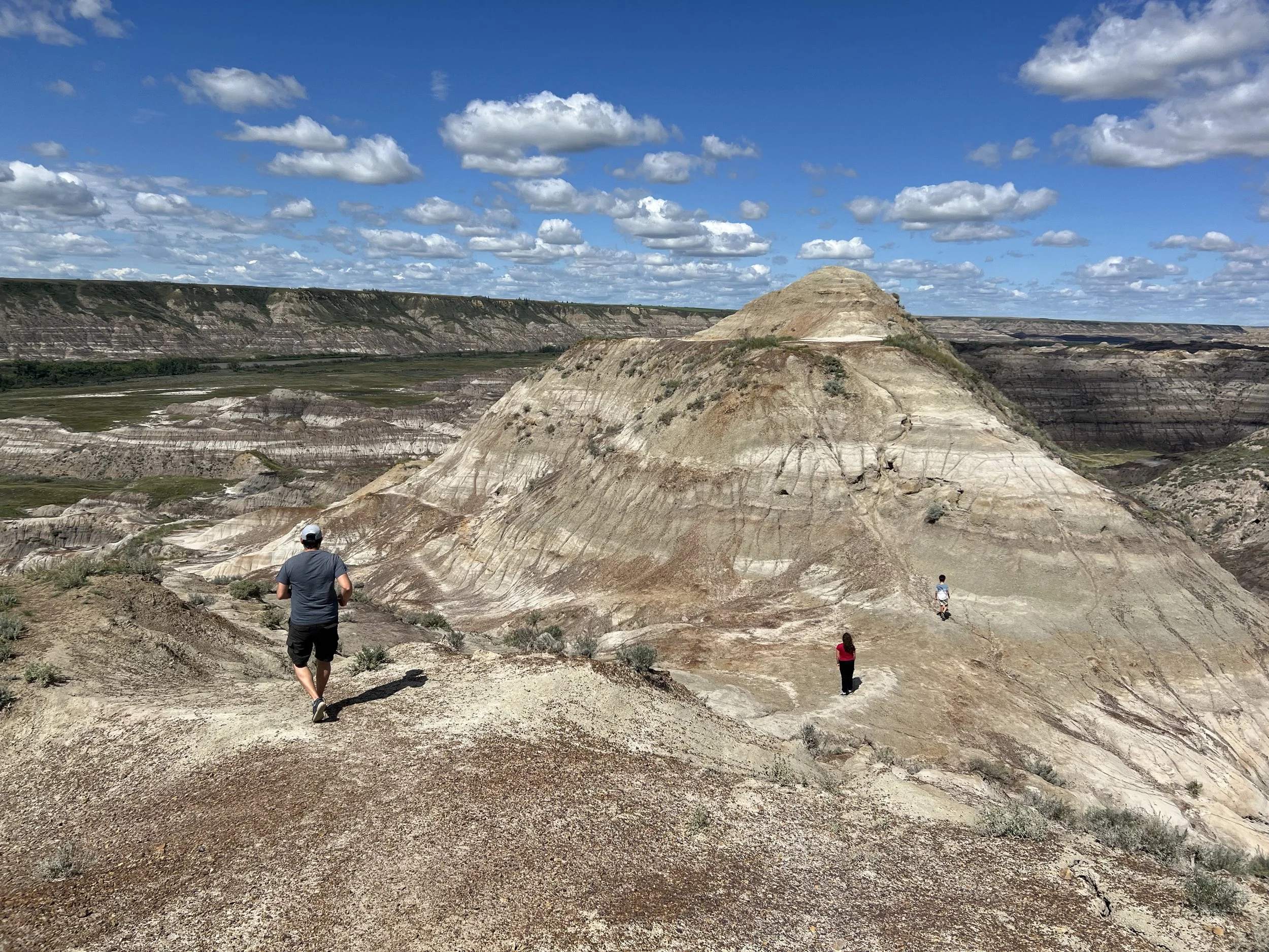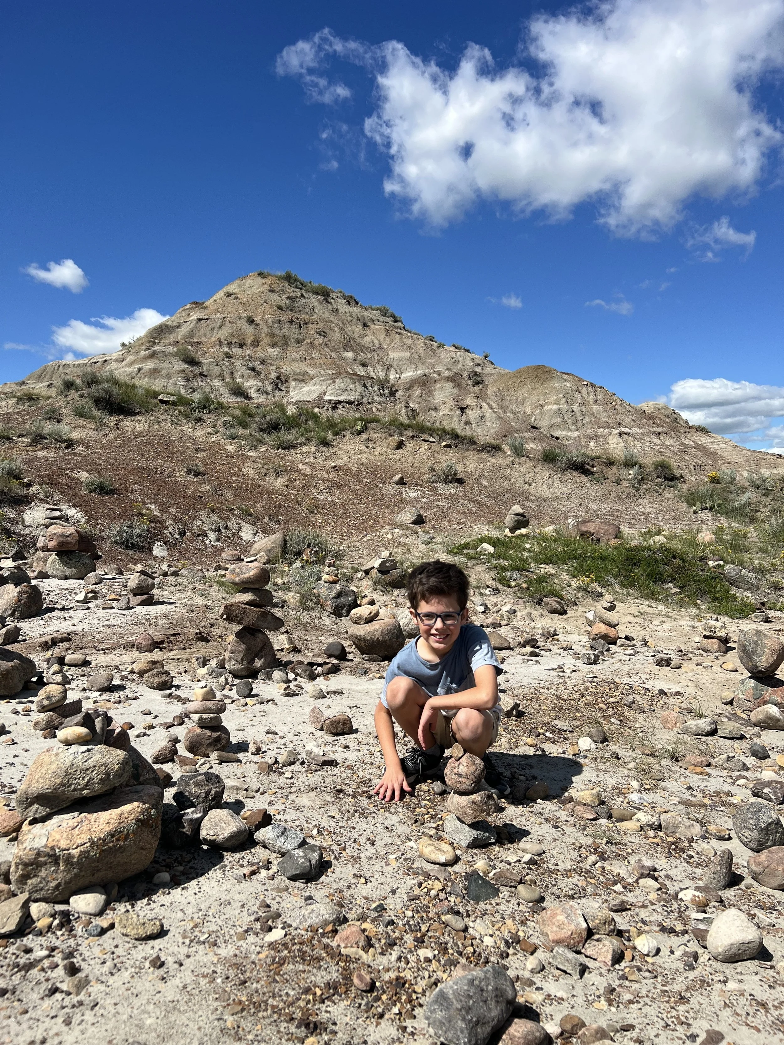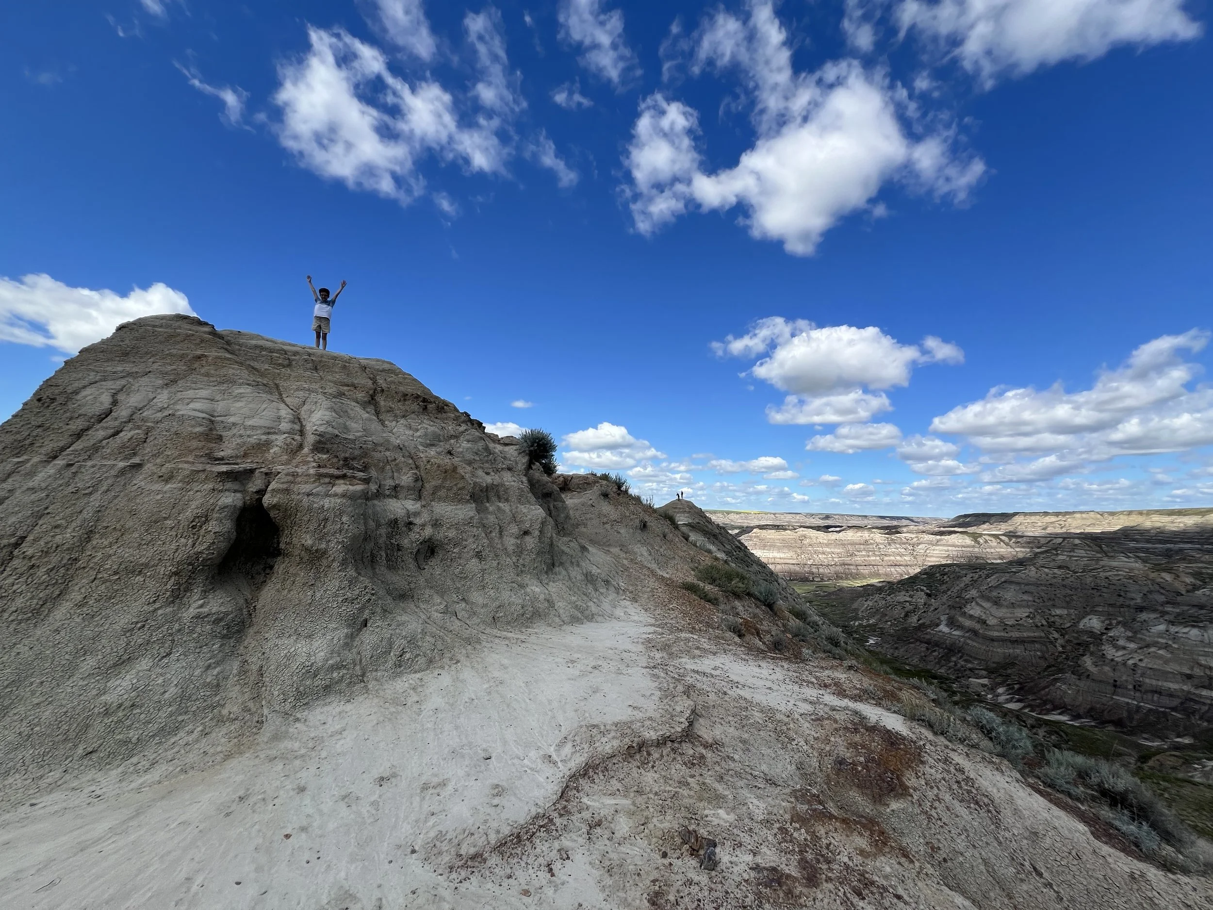 We spent about three hours at the Royal Tyrrell Museum, the world-renowned dinosaur museum. I had been there when I was six but remembered very little. In the afternoon, we hiked through the striking Horse Thief Canyon with its iconic Badlands scenery. The next day, August 12, was my birthday! We found a cozy café and played board games together as a family. Days of true rest are rare on this adventure, so it was exactly what I needed. Later, we hiked the hoodoos—though really, it was more like scrambling up and sliding back down on our backsides (except for my husband, who climbed like a mountain goat!). It was a fun challenge to reach the top!