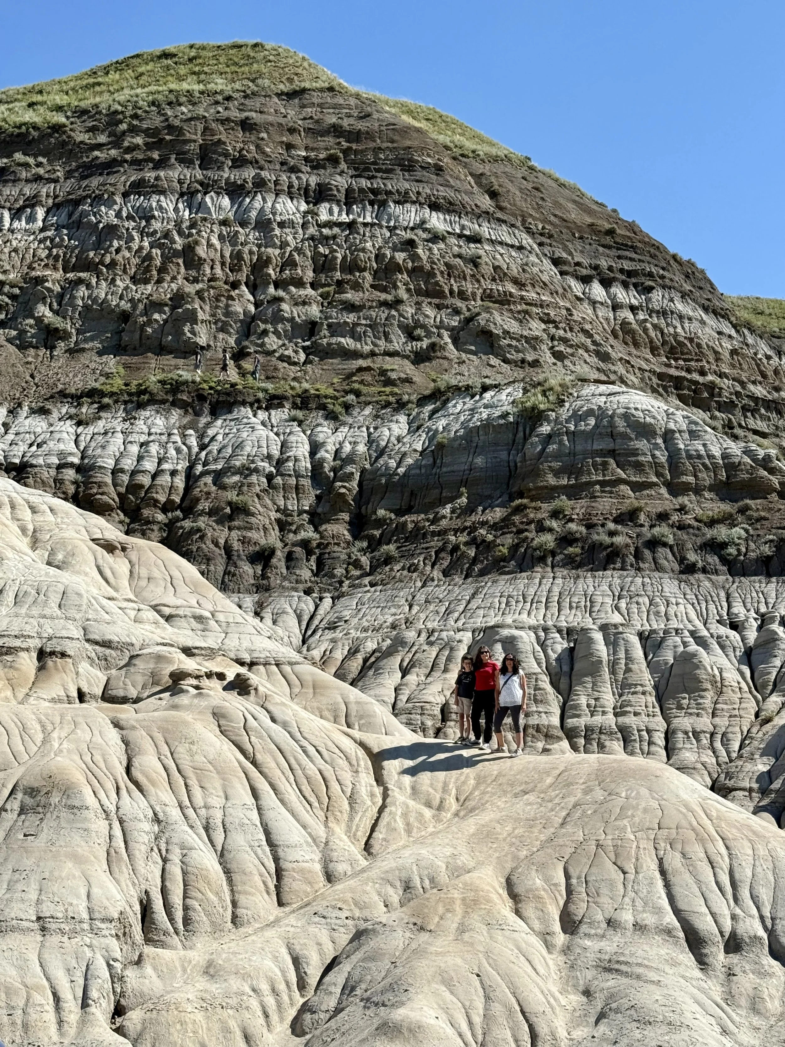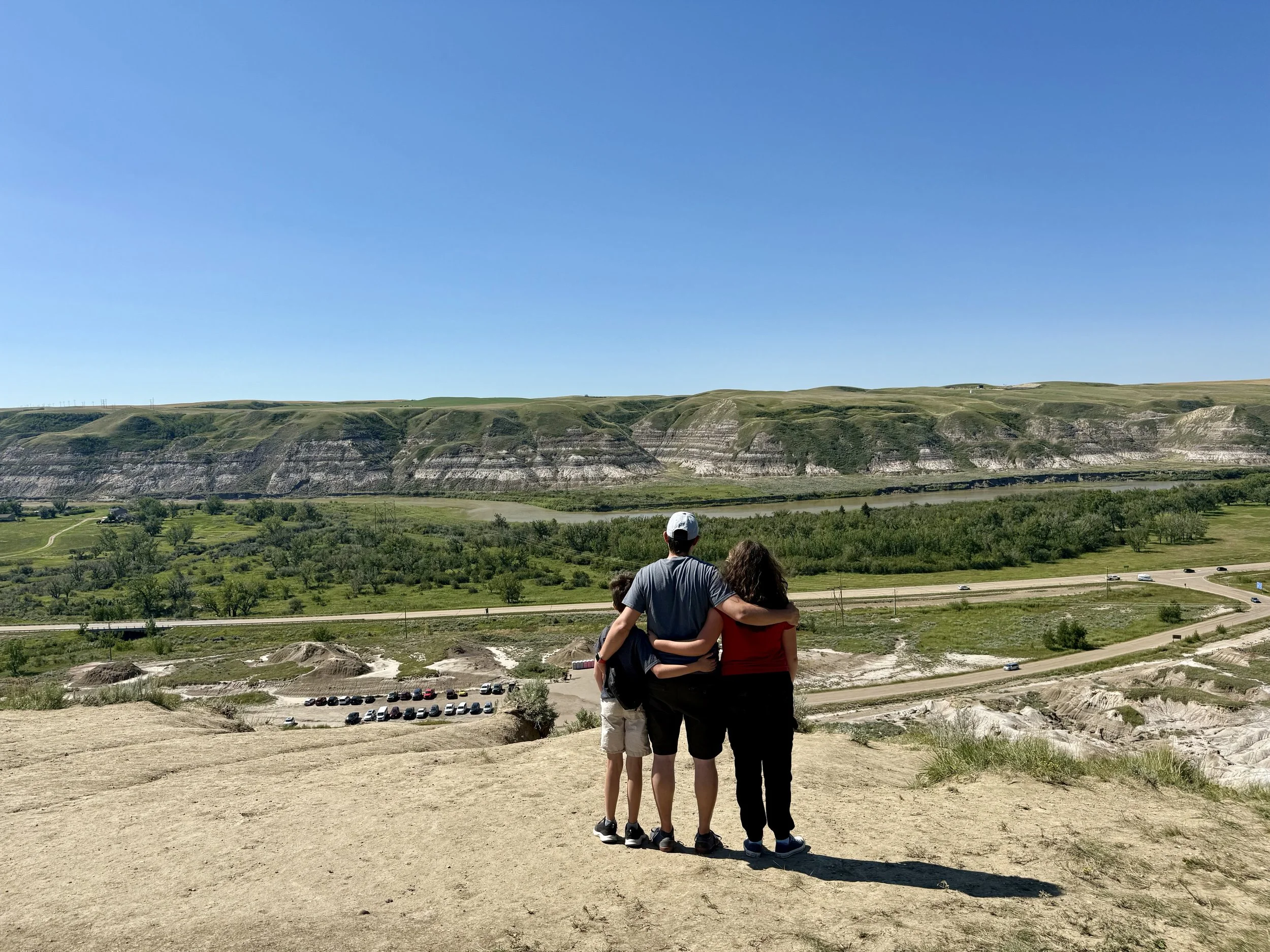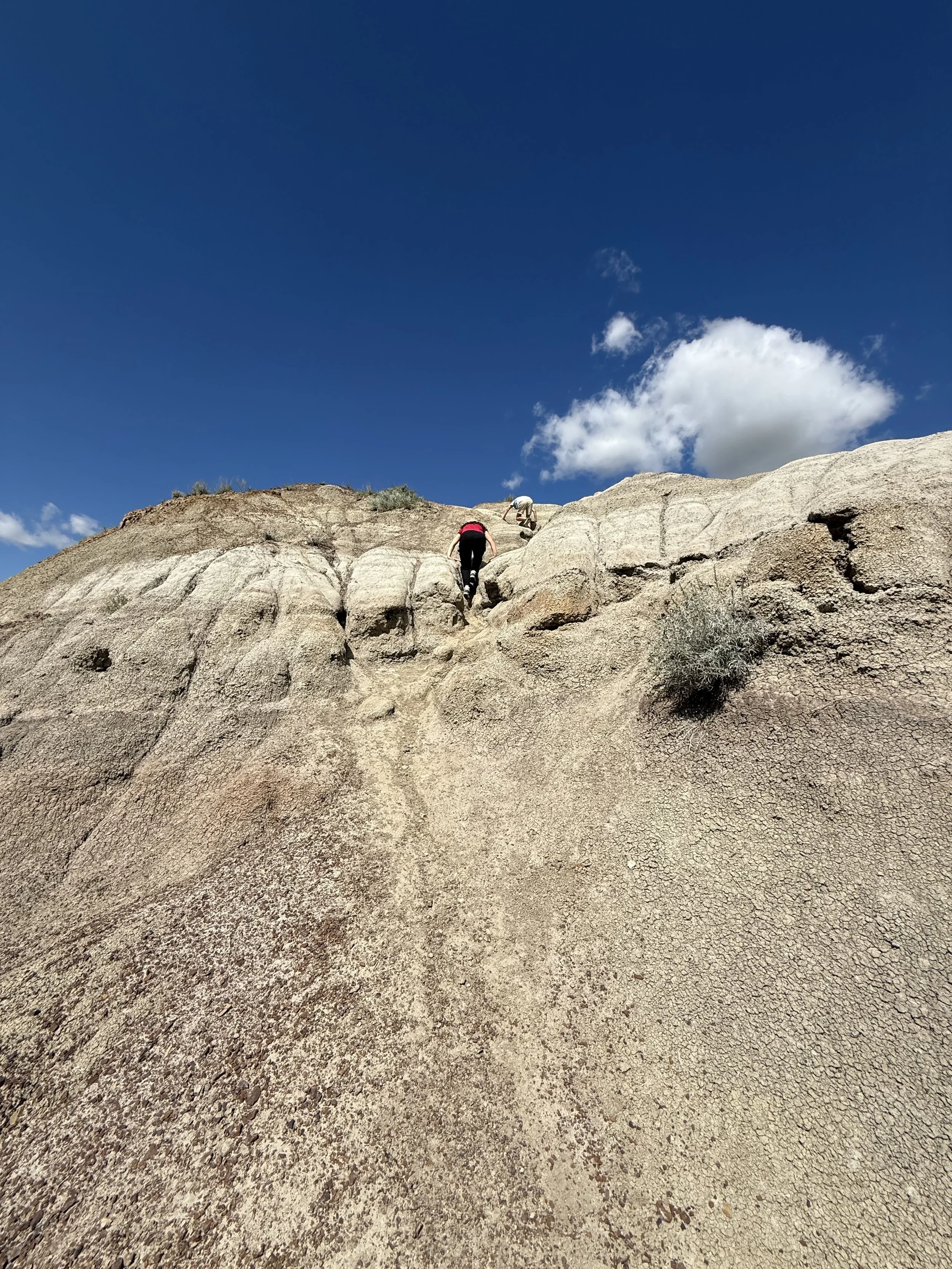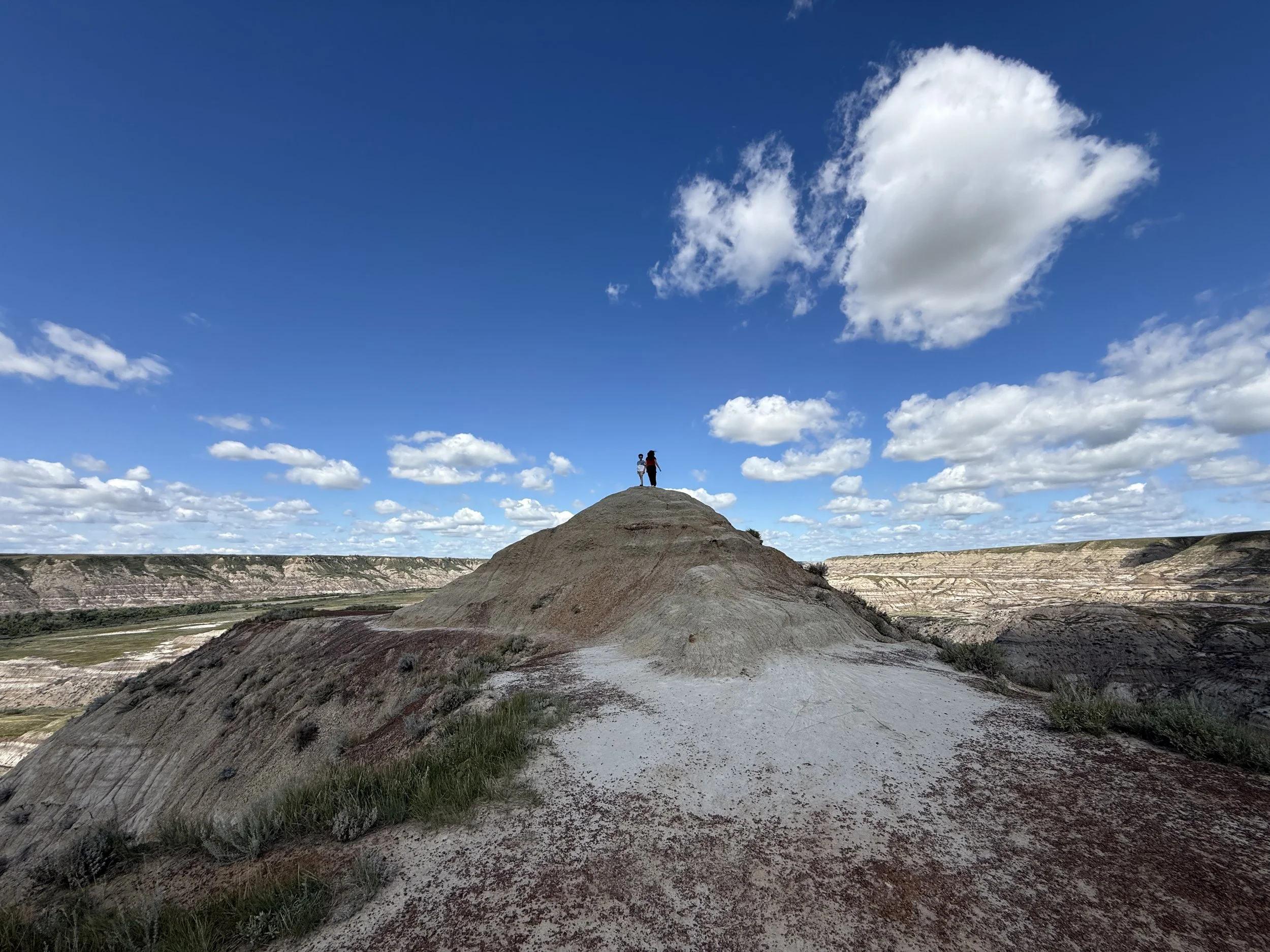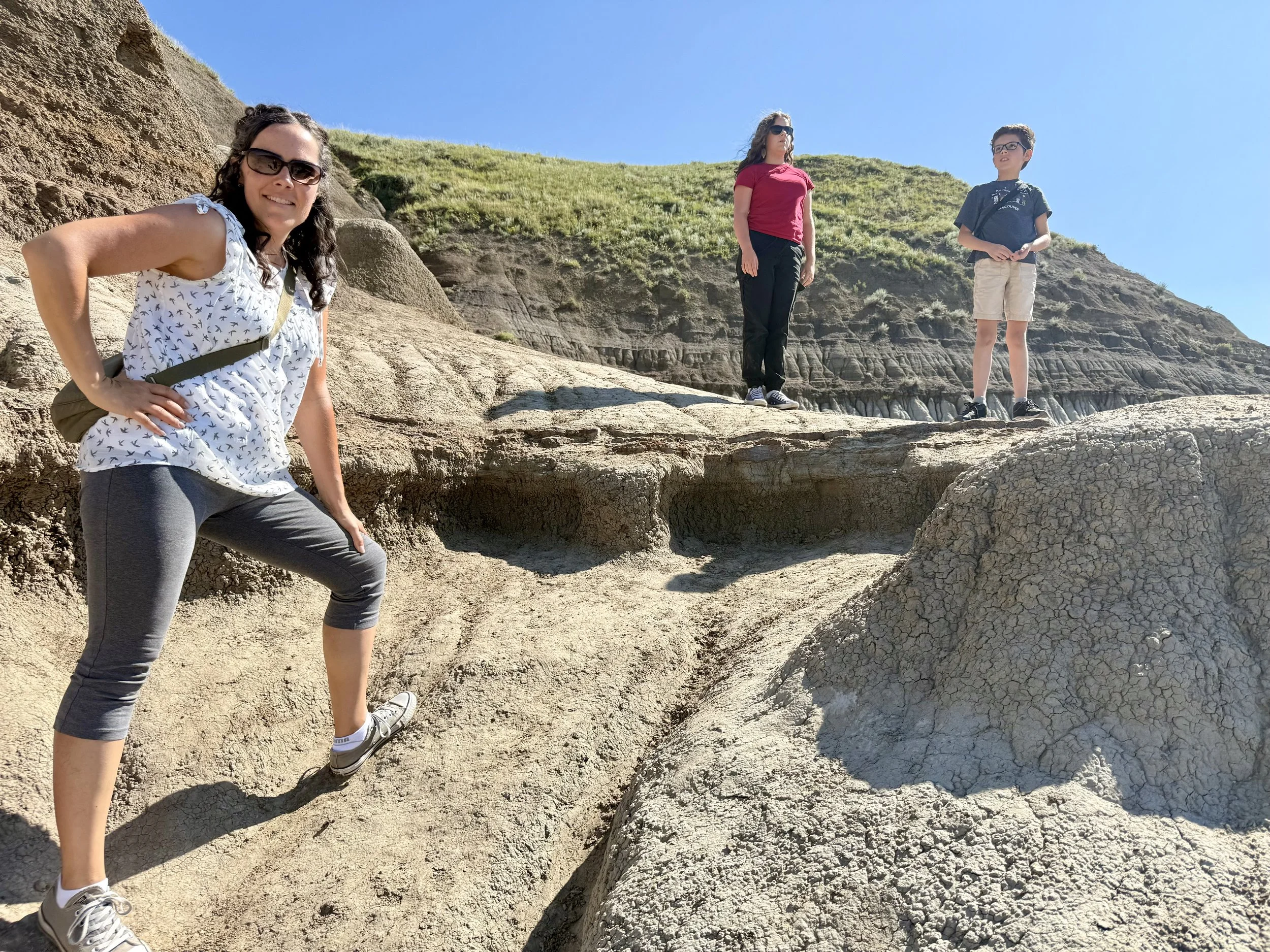 We spent about three hours at the Royal Tyrrell Museum, the world-renowned dinosaur museum. I had been there when I was six but remembered very little. In the afternoon, we hiked through the striking Horse Thief Canyon with its iconic Badlands scenery. The next day, August 12, was my birthday! We found a cozy café and played board games together as a family. Days of true rest are rare on this adventure, so it was exactly what I needed. Later, we hiked the hoodoos—though really, it was more like scrambling up and sliding back down on our backsides (except for my husband, who climbed like a mountain goat!). It was a fun challenge to reach the top!