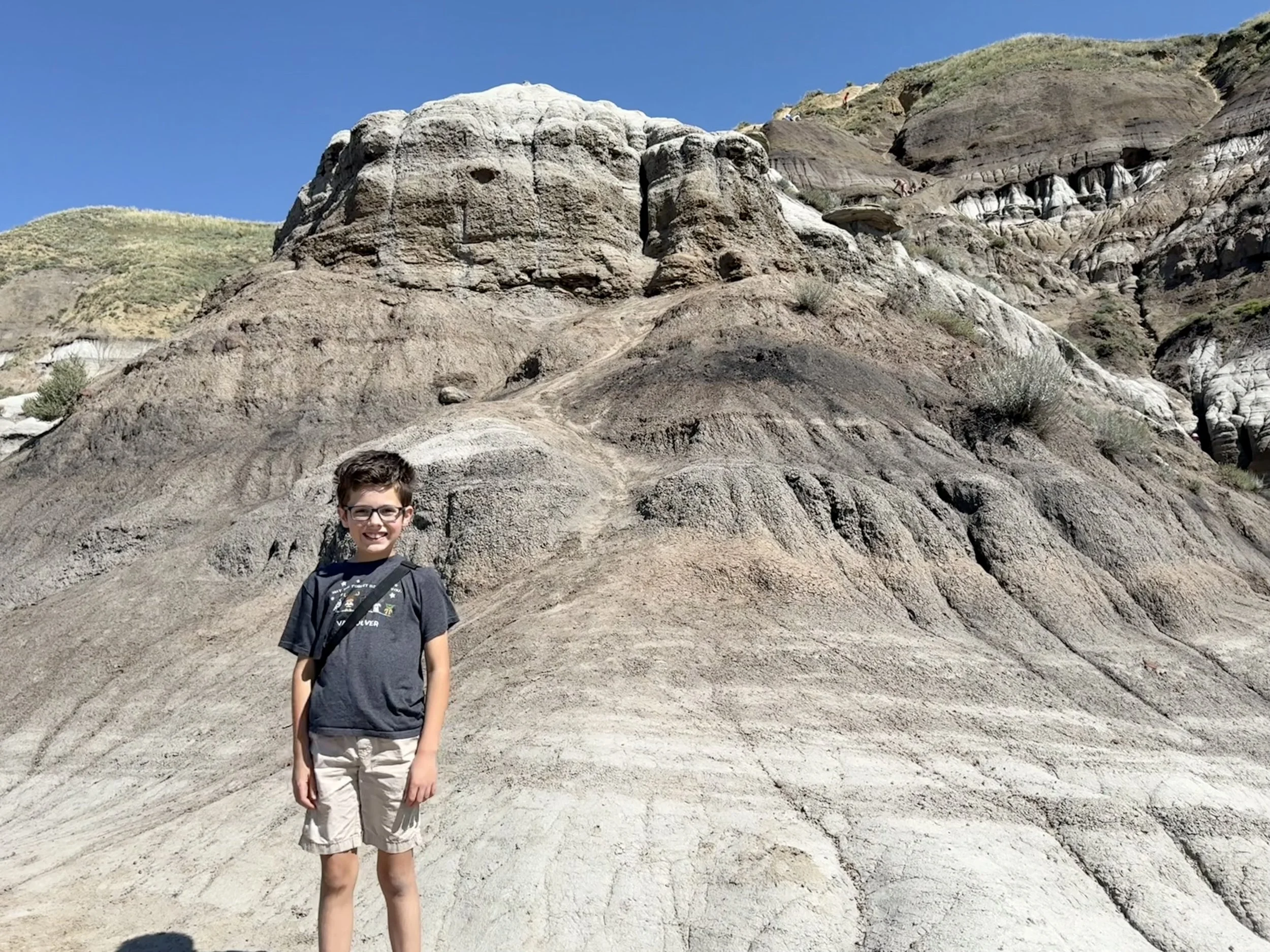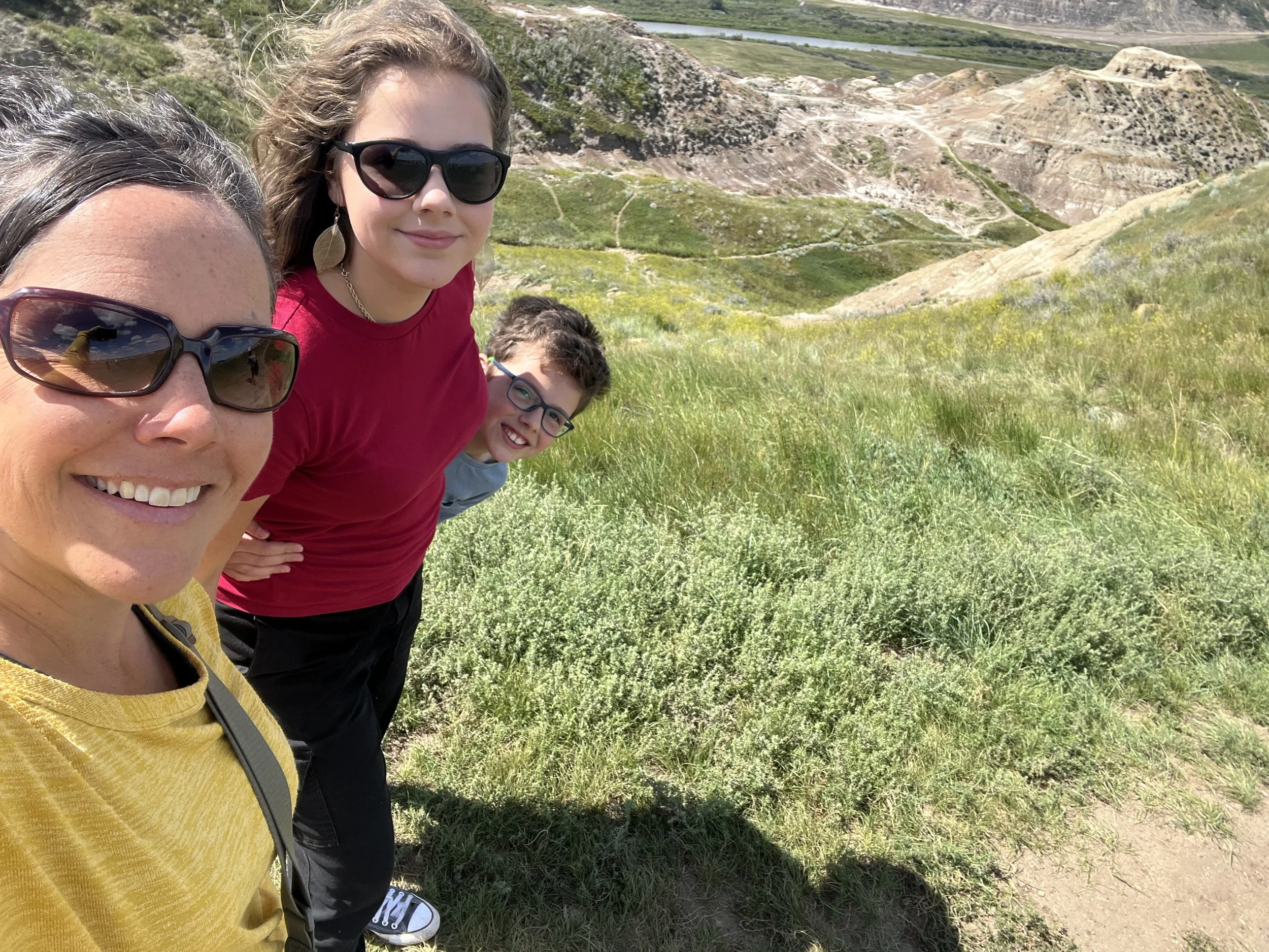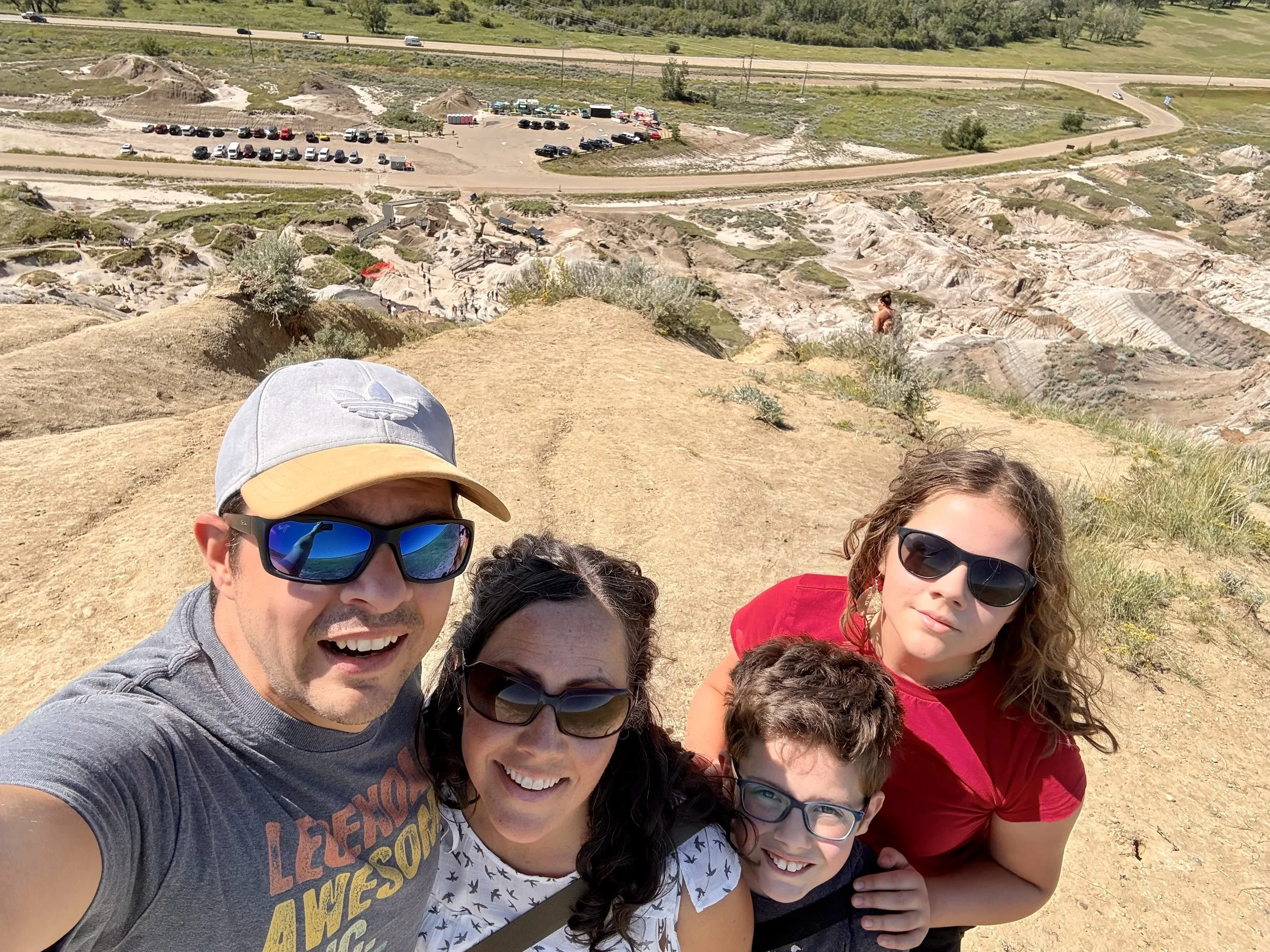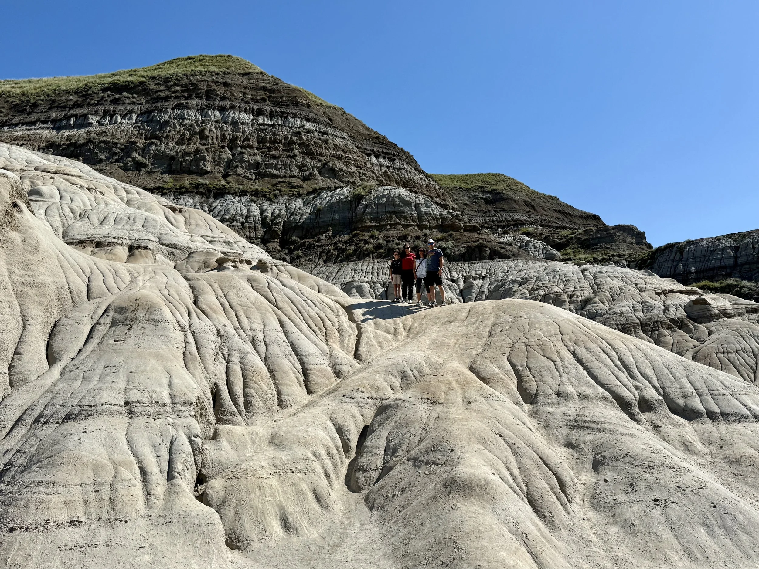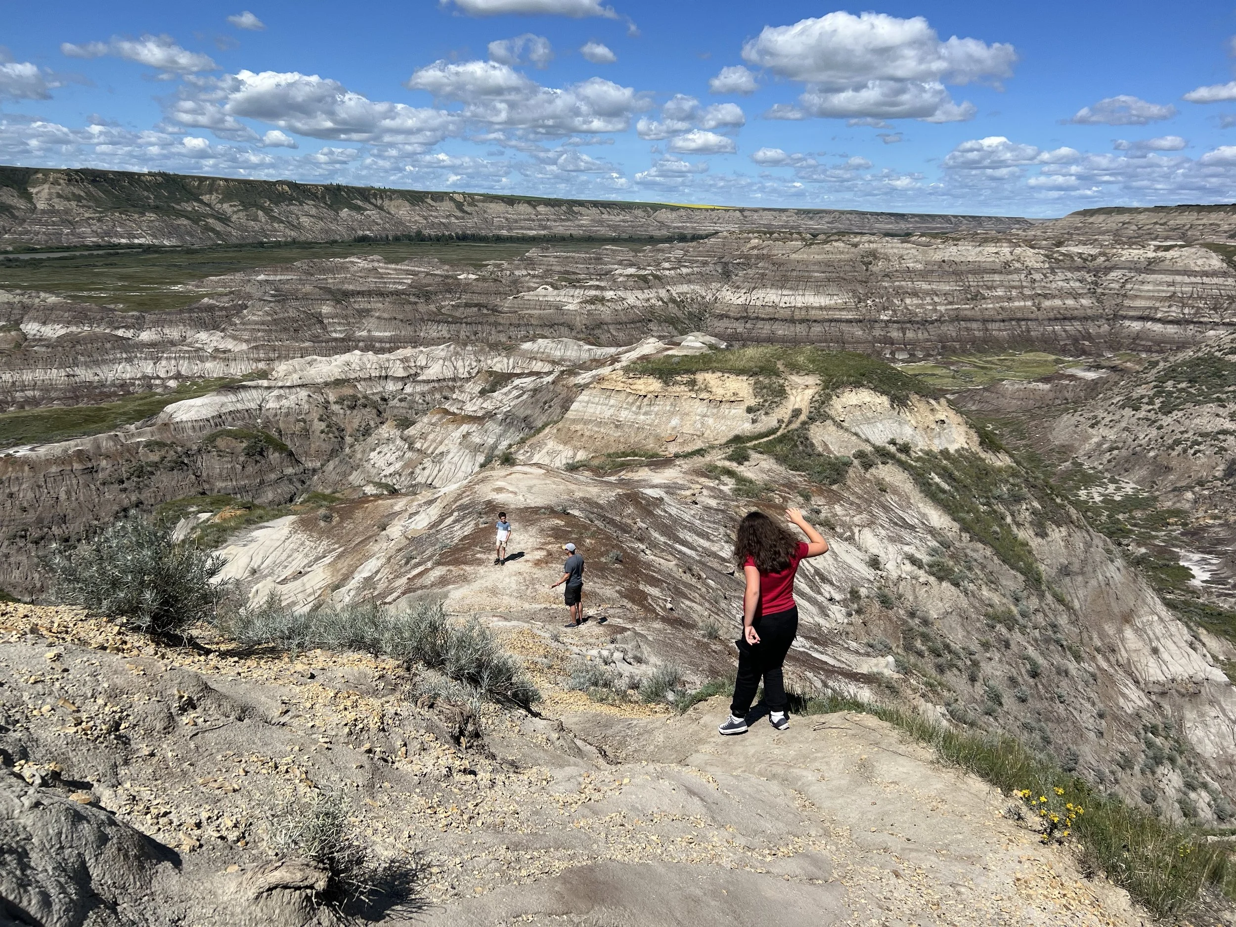 We spent about three hours at the Royal Tyrrell Museum, the world-renowned dinosaur museum. I had been there when I was six but remembered very little. In the afternoon, we hiked through the striking Horse Thief Canyon with its iconic Badlands scenery. The next day, August 12, was my birthday! We found a cozy café and played board games together as a family. Days of true rest are rare on this adventure, so it was exactly what I needed. Later, we hiked the hoodoos—though really, it was more like scrambling up and sliding back down on our backsides (except for my husband, who climbed like a mountain goat!). It was a fun challenge to reach the top!