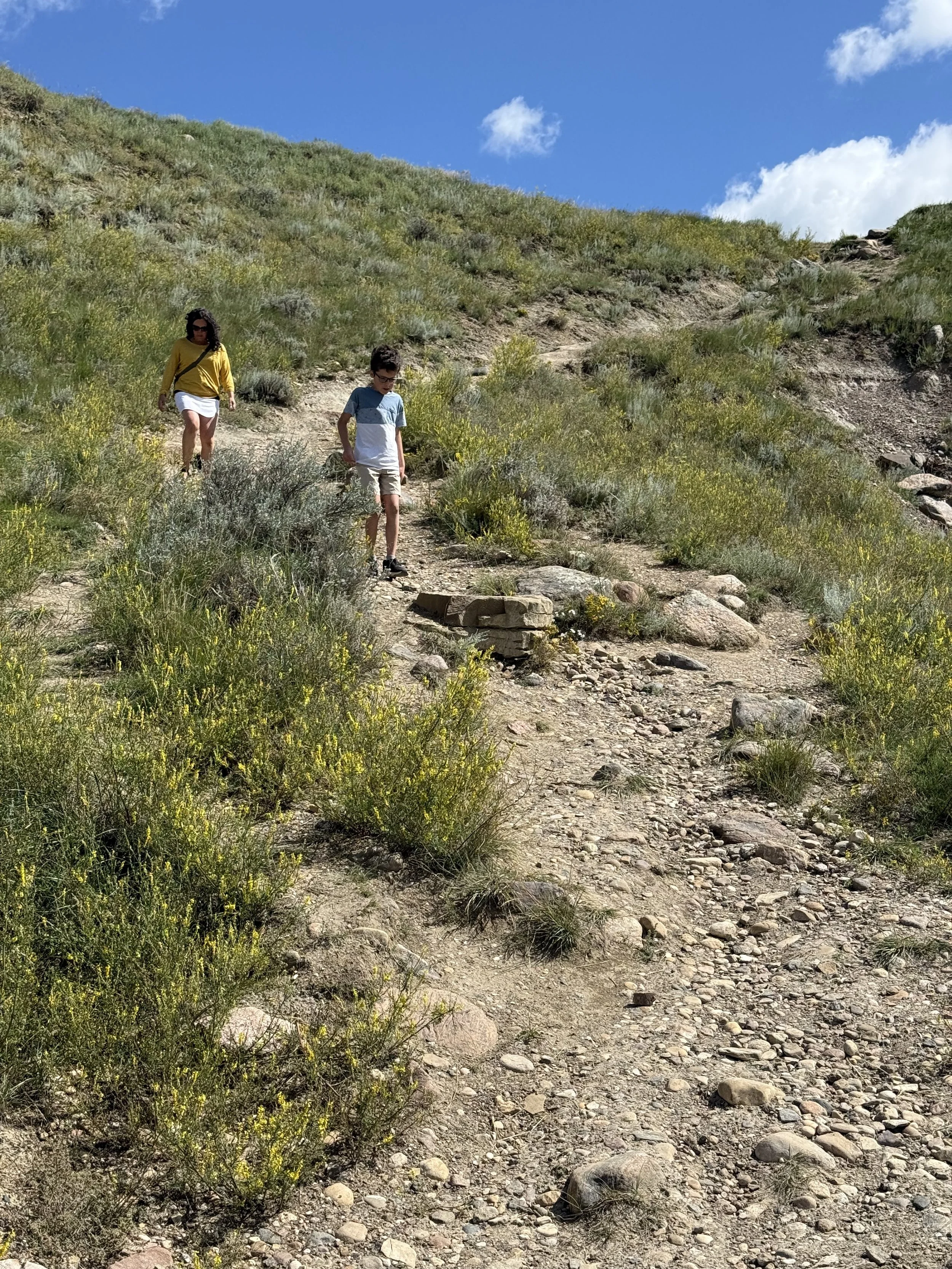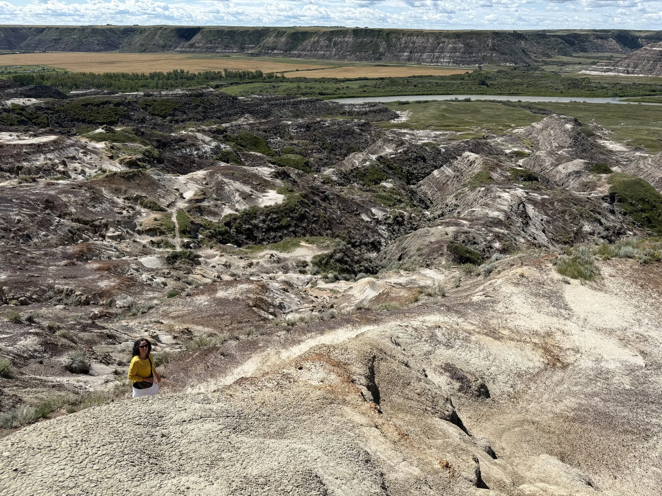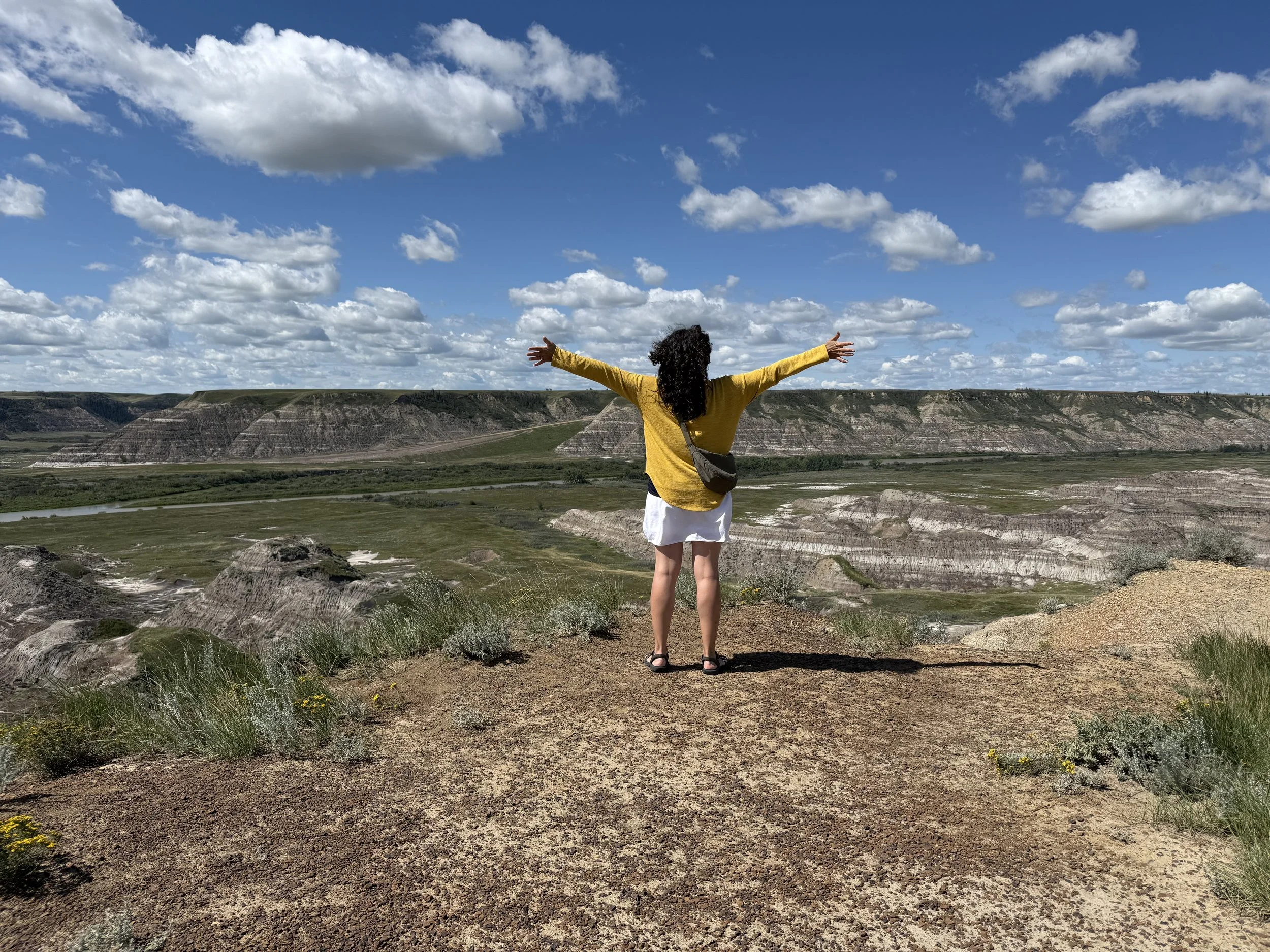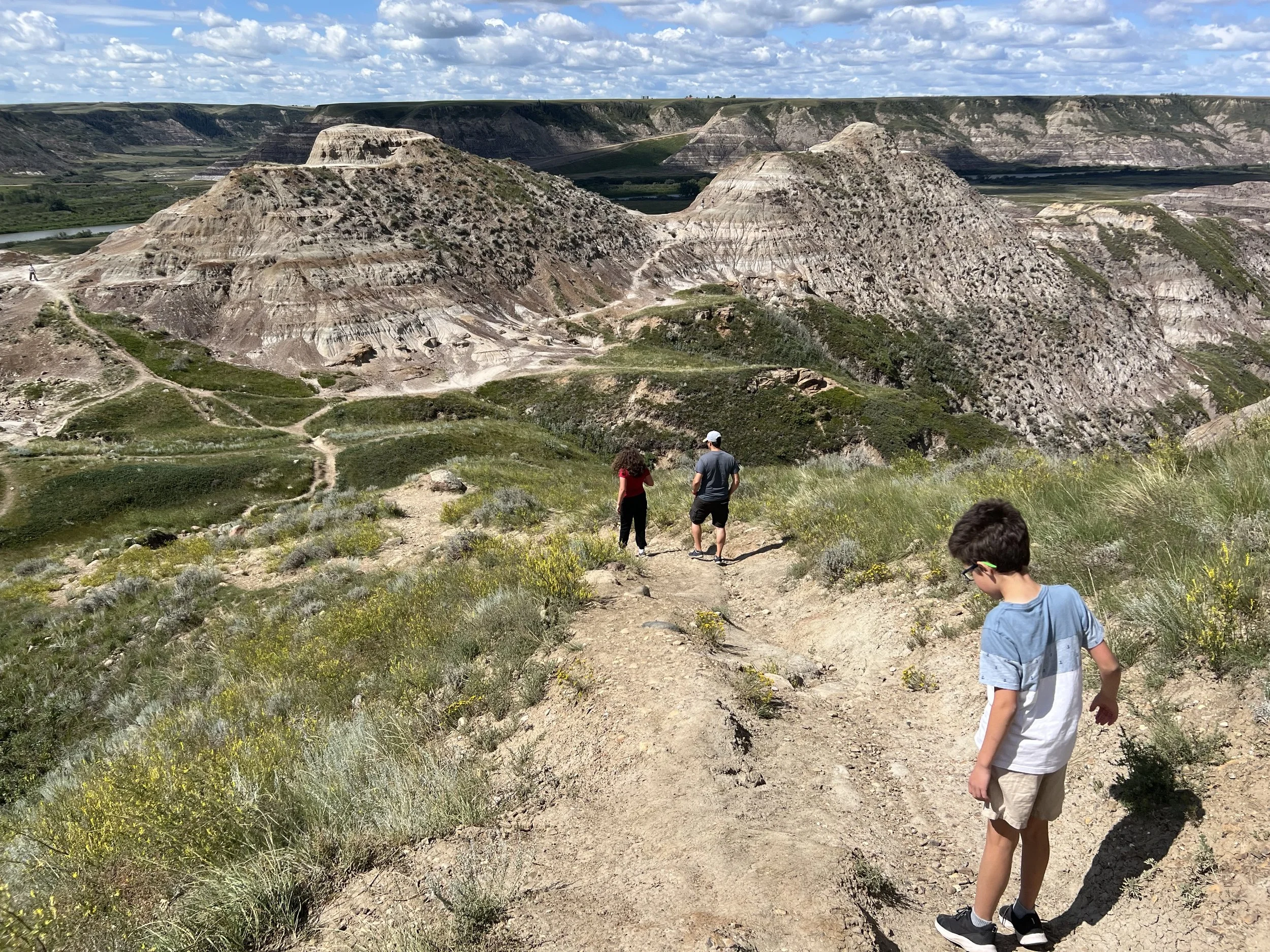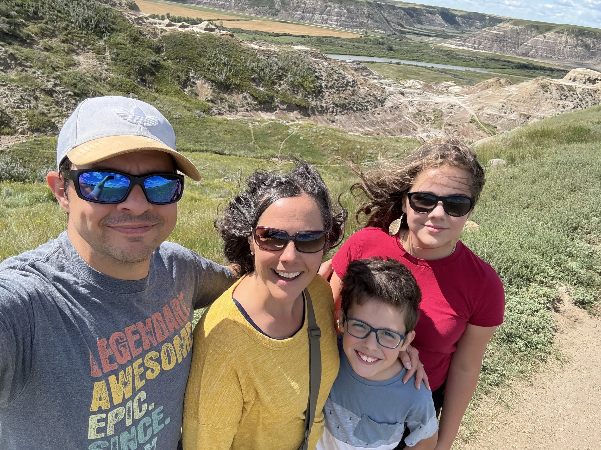 We spent about three hours at the Royal Tyrrell Museum, the world-renowned dinosaur museum. I had been there when I was six but remembered very little. In the afternoon, we hiked through the striking Horse Thief Canyon with its iconic Badlands scenery. The next day, August 12, was my birthday! We found a cozy café and played board games together as a family. Days of true rest are rare on this adventure, so it was exactly what I needed. Later, we hiked the hoodoos—though really, it was more like scrambling up and sliding back down on our backsides (except for my husband, who climbed like a mountain goat!). It was a fun challenge to reach the top!