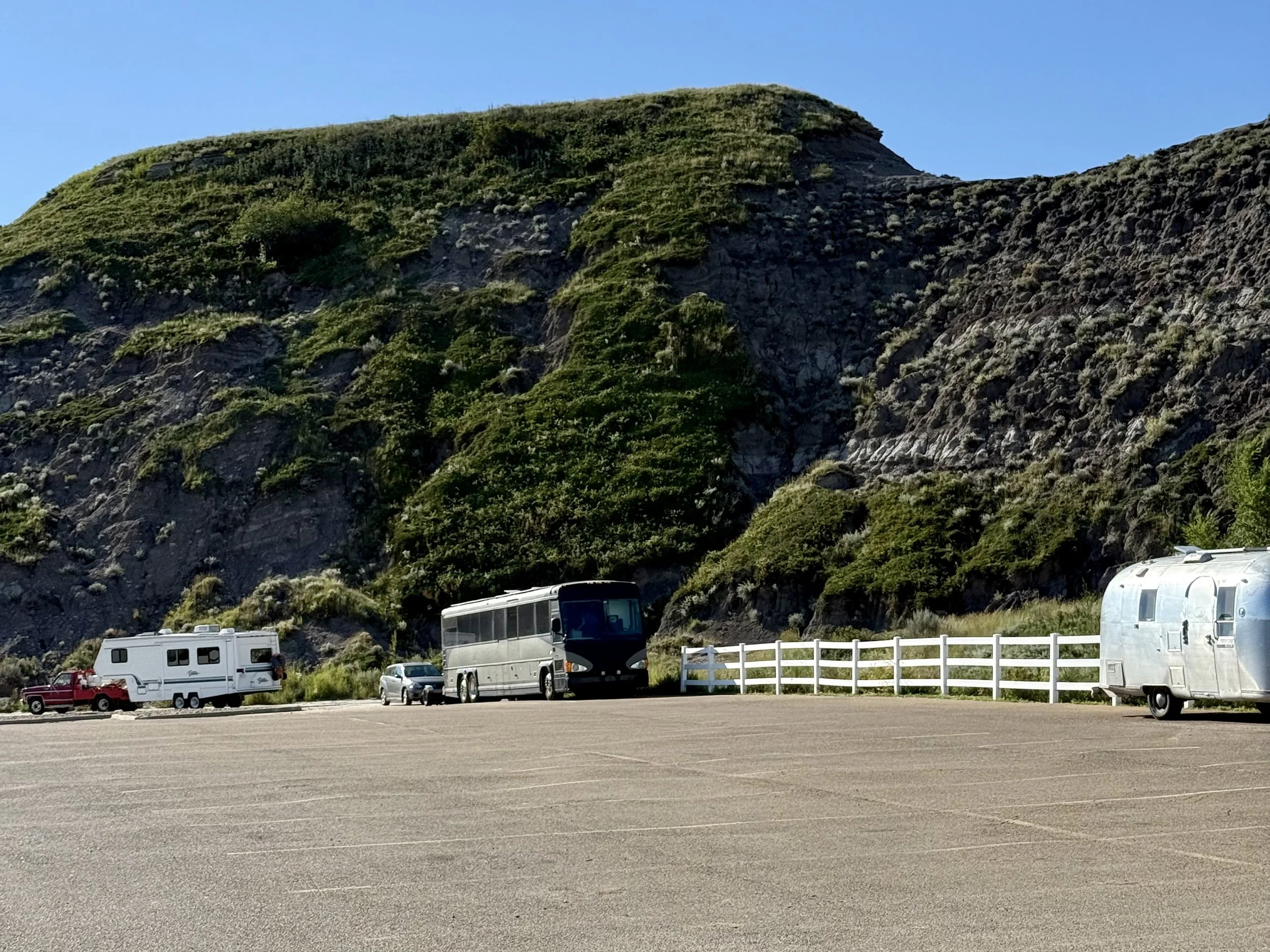 In the early evening, we hit the road toward Drumheller, the “dinosaur capital” in the Badlands. I had called the Walmart there ahead of time to ask if we could park for two nights, and the lady laughed, saying some travelers stay for a week! I was surprised since Walmart usually allows just one night. It turned out to be the perfect base for exploring the area without moving the bus every day.