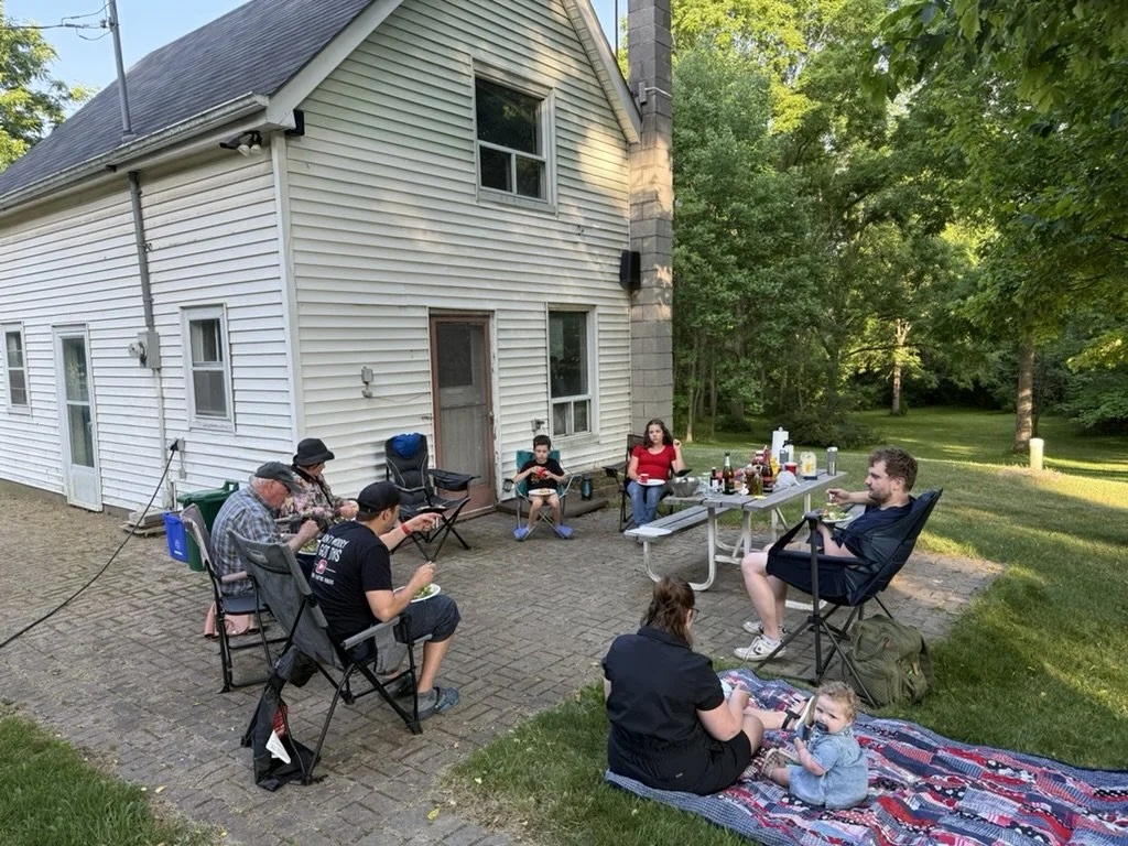 On aime bien jaser avec notre hôte. On partage toutes sortes d’histoires, on en apprend sur leurs enfants et petits-enfants, l’histoire de leur famille, etc. On les invite, sa femme et lui, à venir partager le souper de fête de Pierre Luc avec nous, ainsi qu’avec Scott (ancien collègue de Pierre Luc), sa femme Mélanie et leur mignon bébé qui habitent à quelques kilomètres d’ici. On se fait un BBQ et on profite du magnifique terrain de nos hôtes et de la table de pique-nique mise à notre disposition.