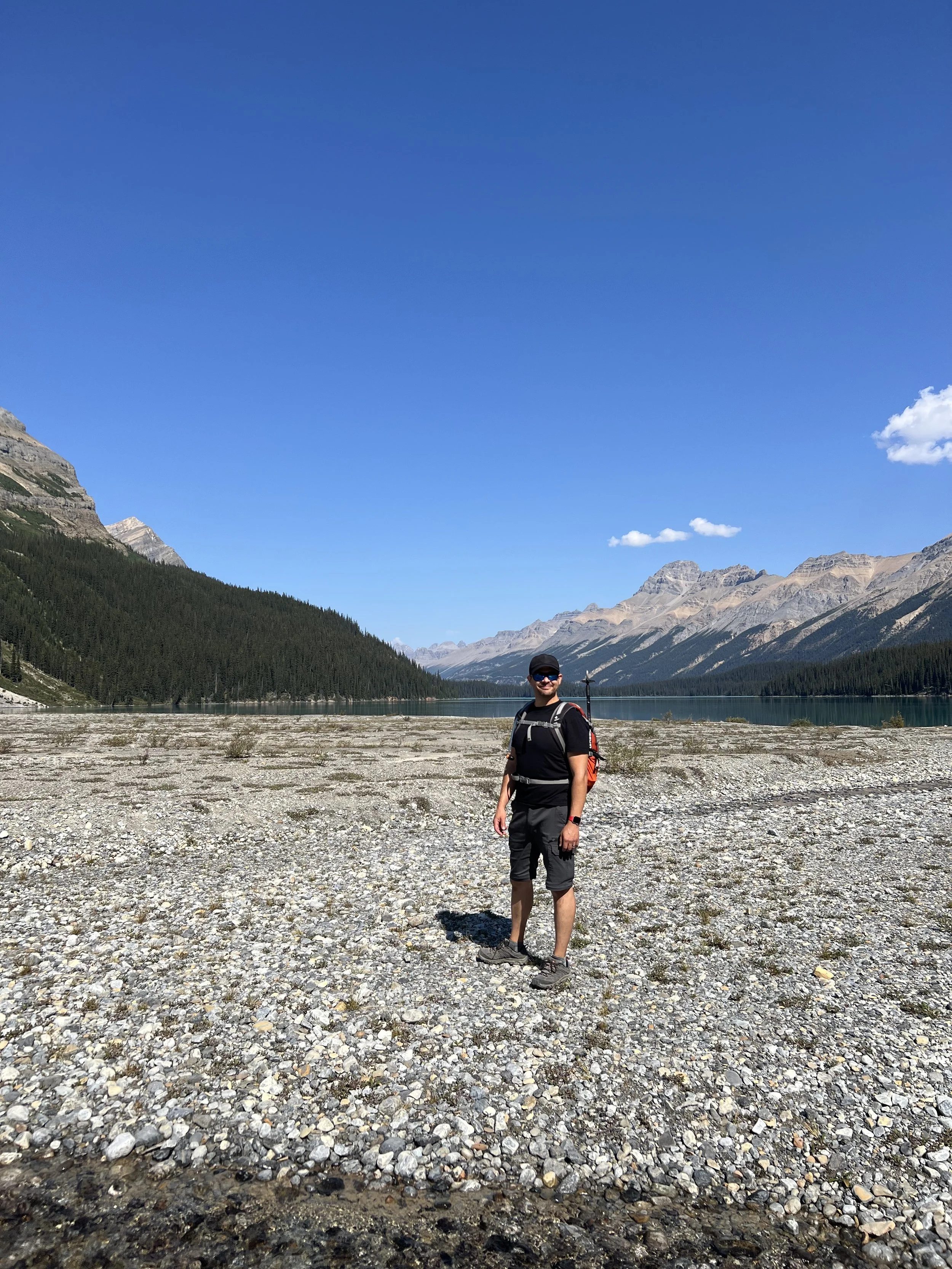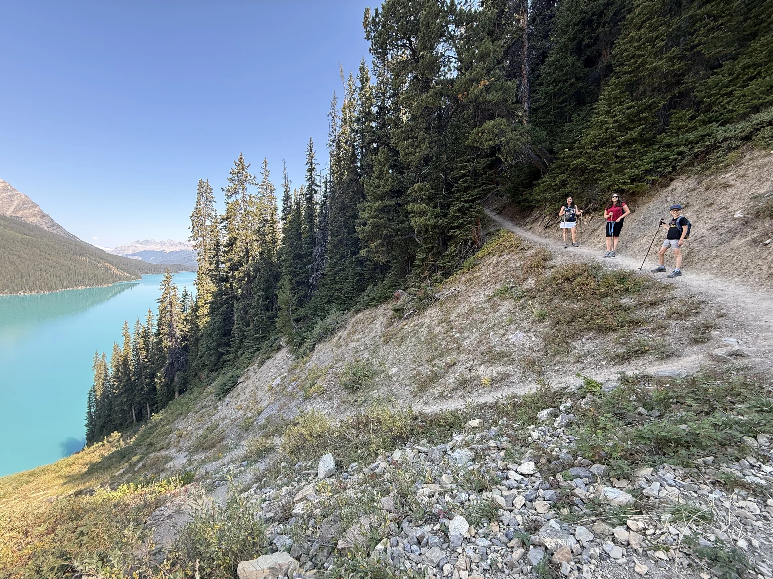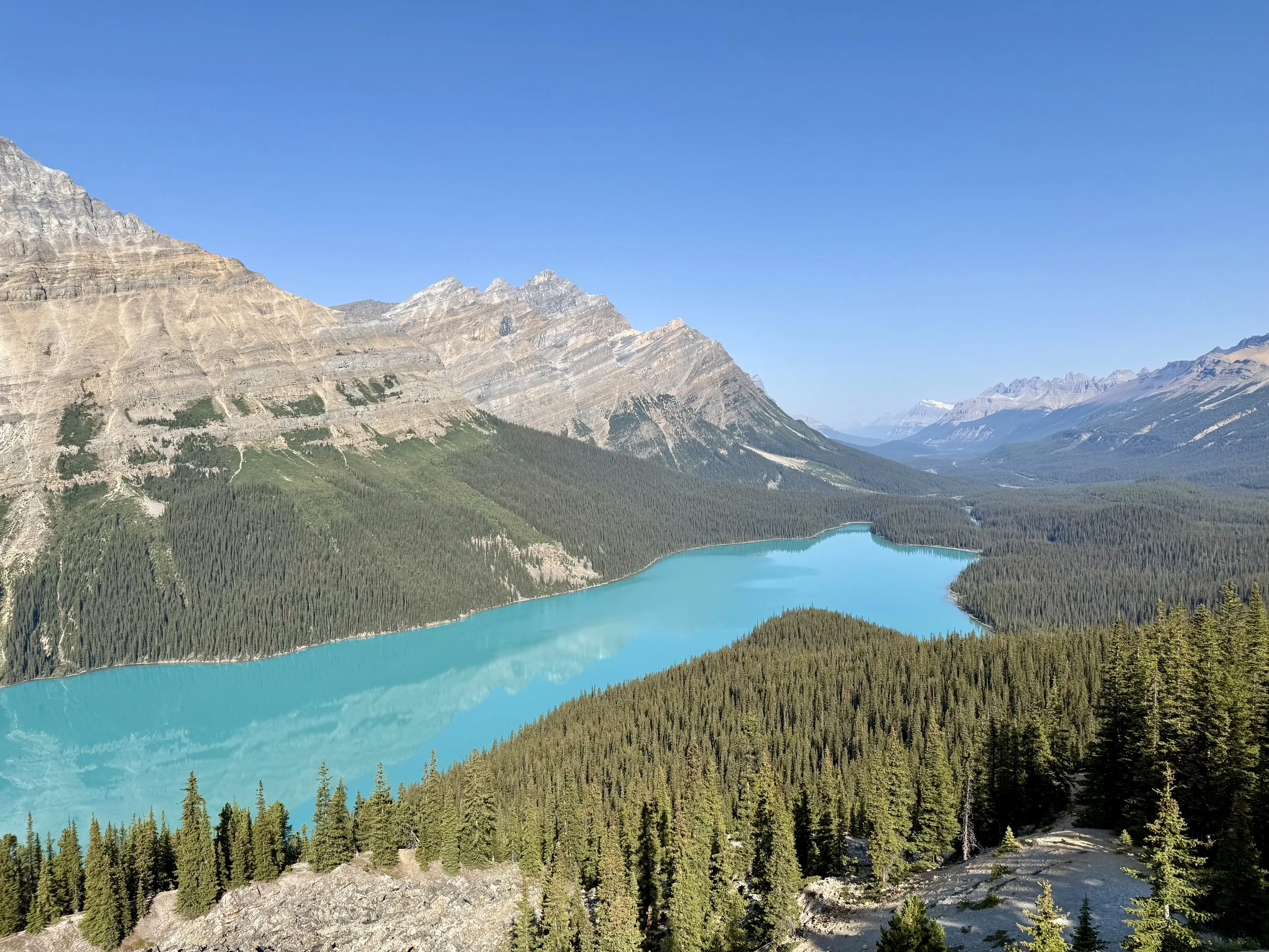 Then we headed to Peyto Lake (pronounced “Pee-toh”) — the famous wolf-shaped lake I’d been so eager to see after reading about it on countless travel forums. After a short 10-minute walk, we reached the main viewpoint… and found it absolutely packed with tourists! Easily the busiest spot we’d seen since the beginning of our trip.