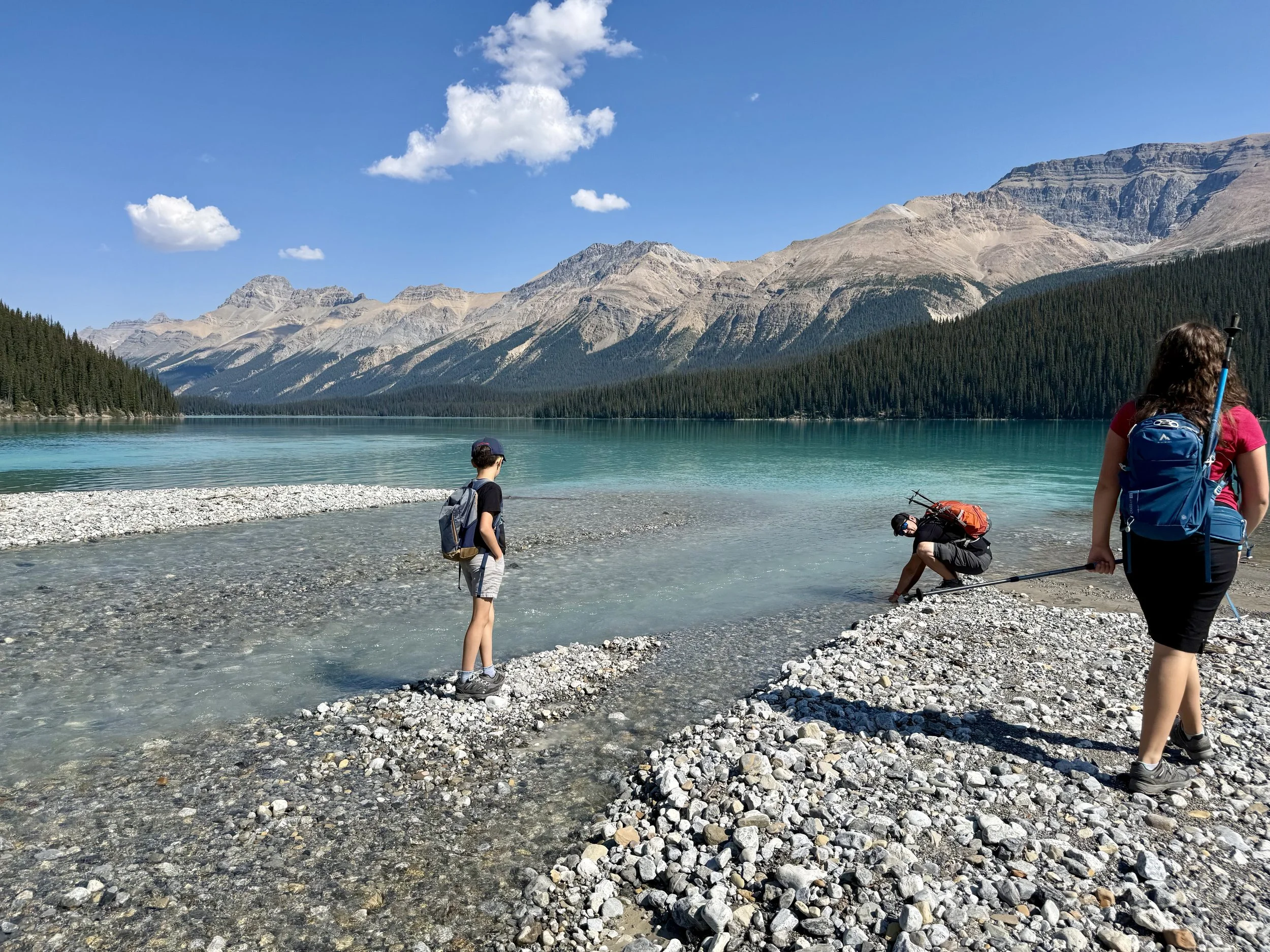 À peine 15 minutes dans le sentier, on obtient un autre point de vue encore plus beau puisqu’on est plus haut. On a ensuite le choix d’aller au sommet ou de descendre au niveau de l’eau. Ayant déjà eu un beau point de vue en hauteur, on décide de descendre la montagne. En 2 heures de randonnée, on croisera seulement une autre famille et un couple. C’est une randonnée assez exigeante. En fait, même la descente était intense par bout. On avait sous-estimé les efforts nécessaires pour remonter. MAIS! Le sentiment d’être seul au creux des montagnes, au niveau de l’eau, était absolument fantastique, la vue l’était tout autant!