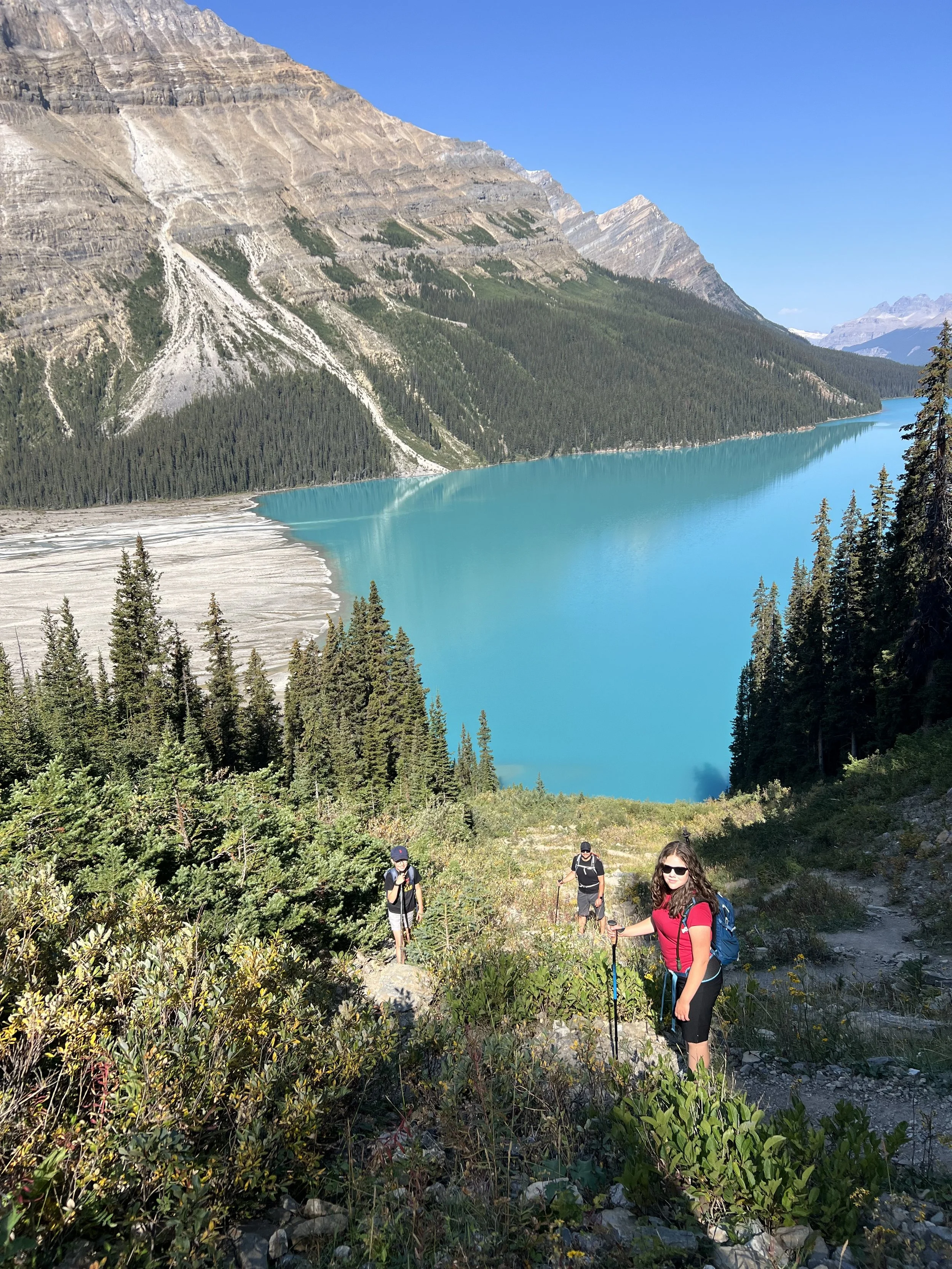 On se dirige ensuite au Peyto Lake (qu’on prononce Pee-toh), le fameux lac à la forme d’un loup. C’est le lac que j’avais le plus hâte de voir tellement j’en ai entendu parler sur des groupes de voyageurs dans l’Ouest. On marche d’abord une dizaine de minutes pour arriver à un point de vue sur le lac. Mais c’est bondé de touristes! Le plus de touristes qu’on a vu à un seul endroit depuis le début du voyage. Sachant que 90% des touristes n’iront probablement pas plus loin que le point de vue le plus accessible, on prend les sentiers de marche pour découvrir le lac sous un autre angle. Quelle bonne décision on a prise!