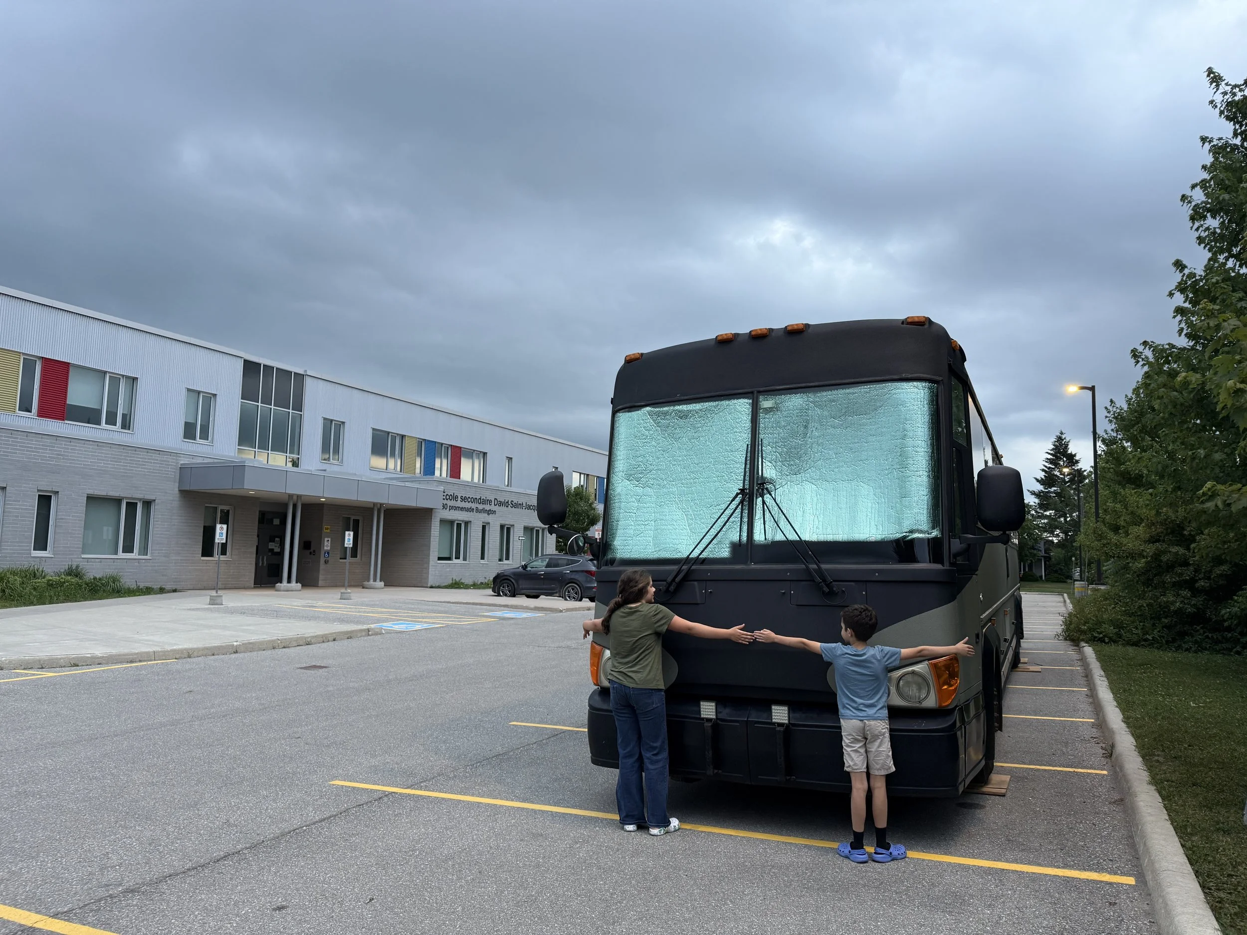 En prenant la route mercredi le 9 juillet, on s’aperçoit d’un problème de suspension. L’autobus penche davantage côté conducteur. On n’a pas vraiment le temps de s’occuper de ce problème maintenant. Notre priorité est d’arriver à temps à Kitchener, en Ontario, pour y passer 3 jours avec des gens qui marqueront notre parcours.