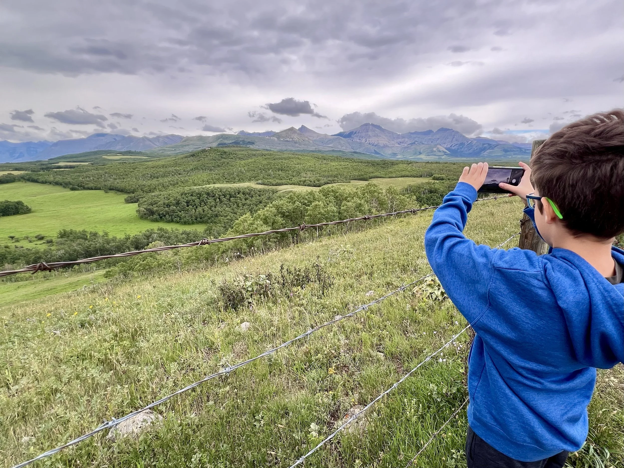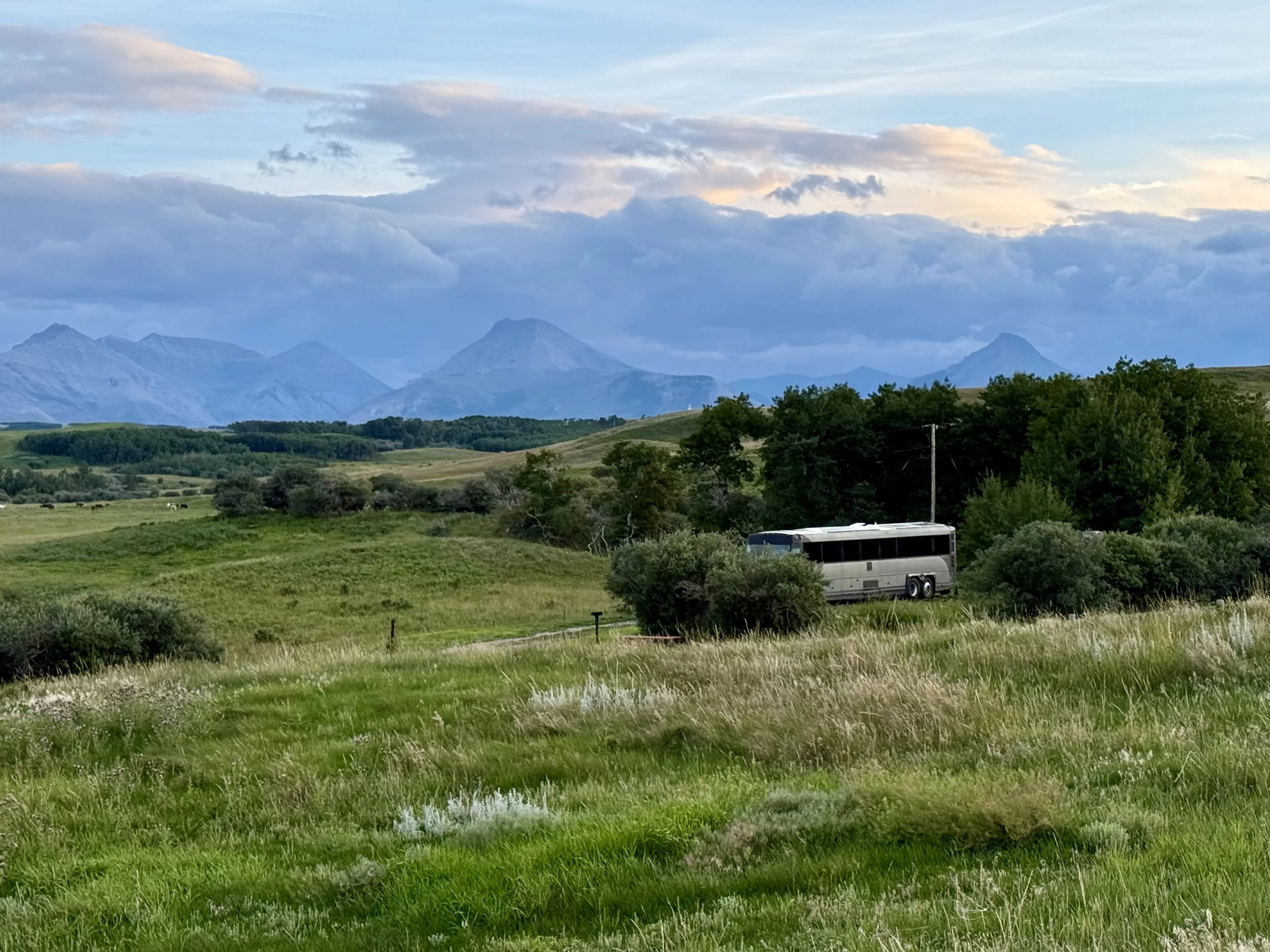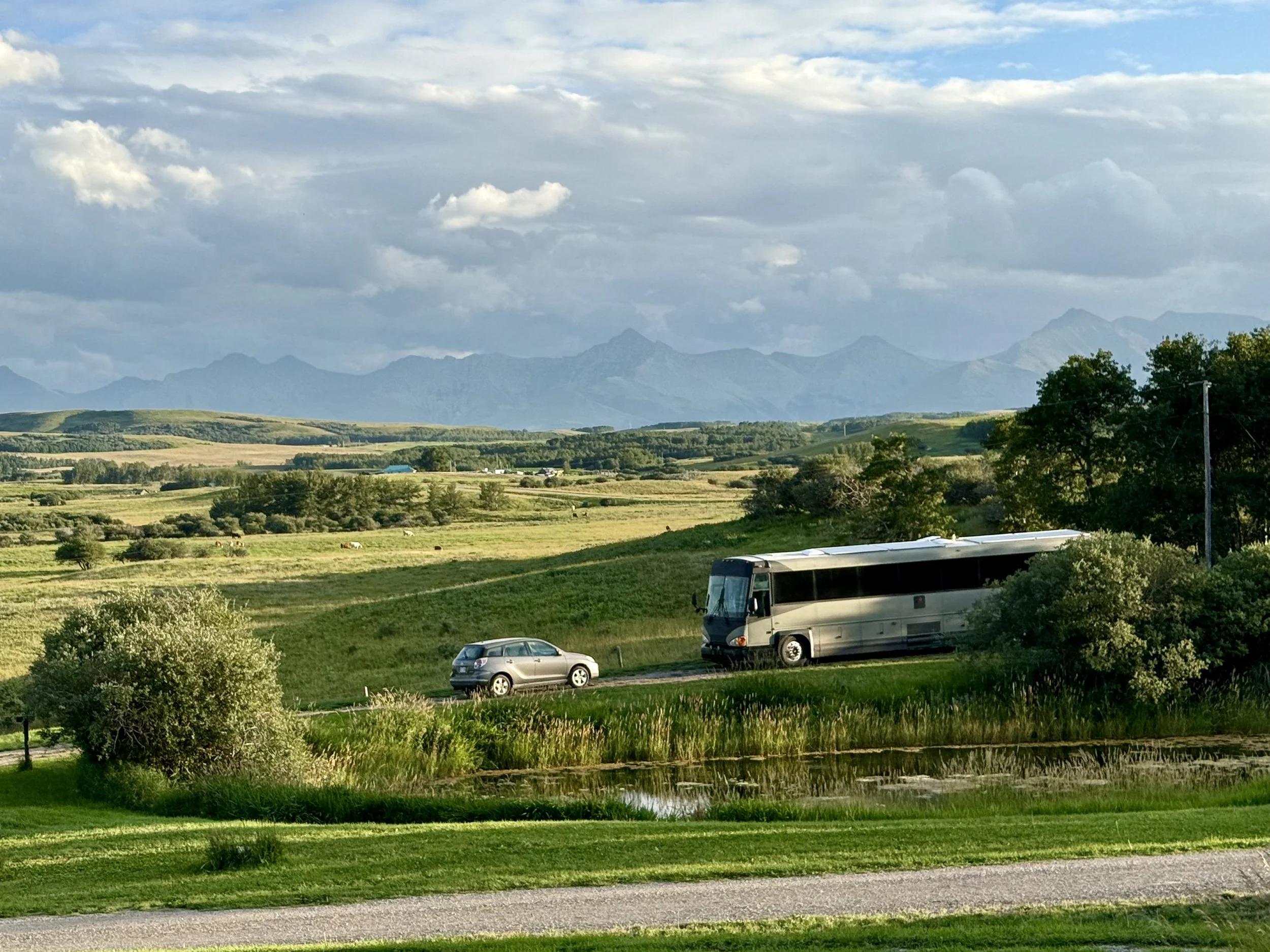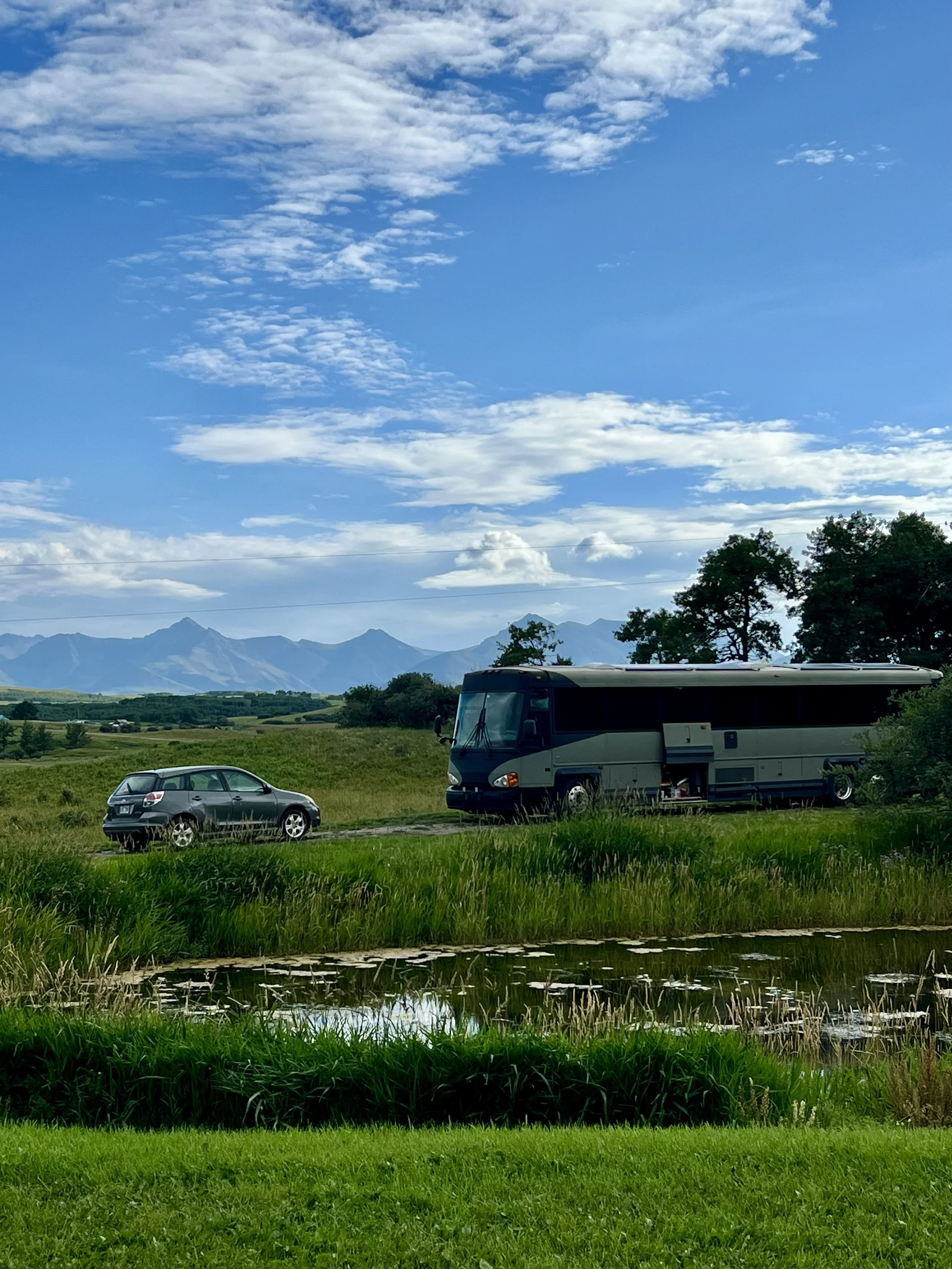 On the morning of August 6th, we hit the road toward a long-awaited destination: a ranch in Pincher Creek, near Waterton National Park in southern Alberta. As soon as we arrived, our host Pat showed us where we could park—an amazing spot with mountain views and a pond right next to us! Much to Anaya’s delight, Pat then introduced us to their horses and shared a bit of their story. We would spend four wonderful days here with our hosts, Pat and Ken.