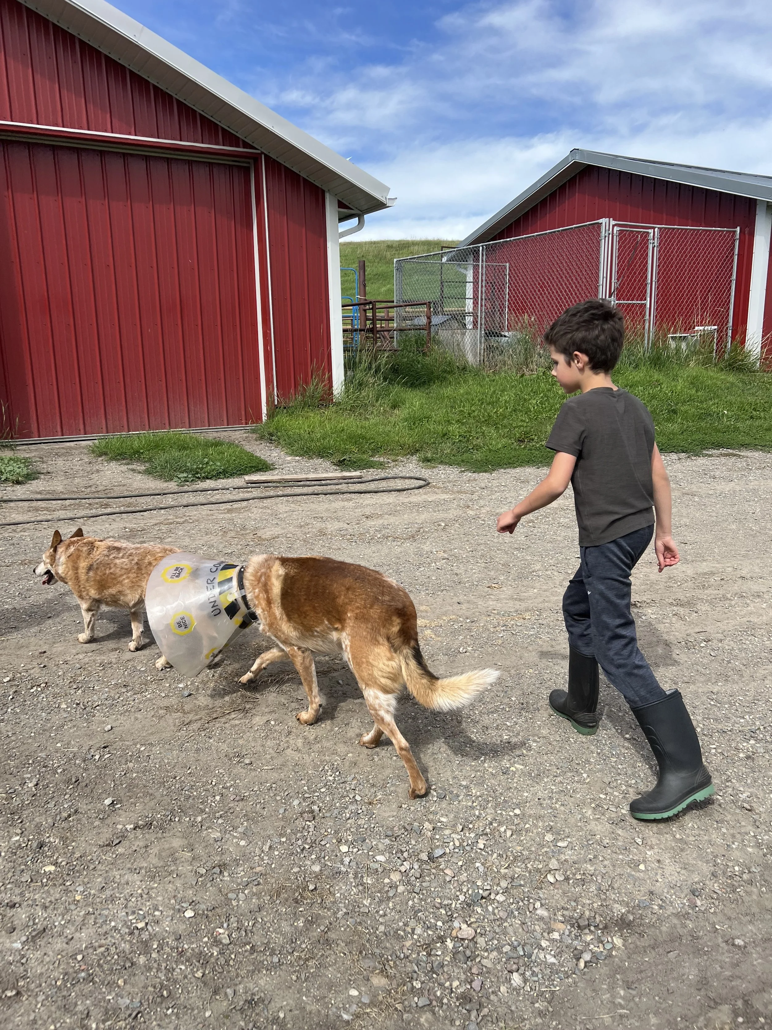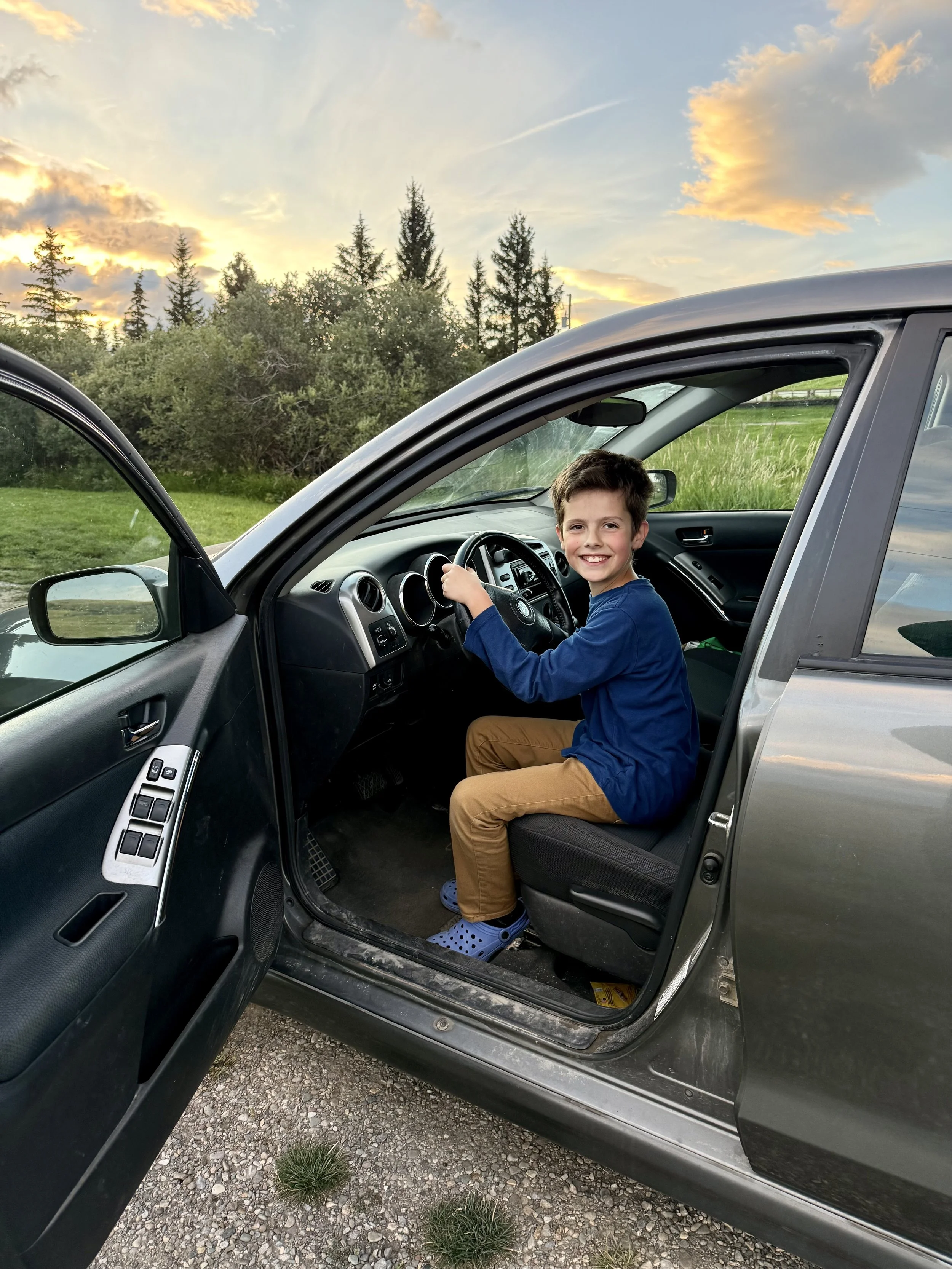 Pat a pris le temps de montrer à Anaya une nouvelle approche pour mettre le licol au cheval. Anaya a même eu l’occasion de nourrir un poulain et sa maman qui n’acceptaient pas facilement de manger dans la main. Anaya les a bien gâtés! Elle s’est aussi installée avec une chaise près des enclos extérieurs pour les observer et les dessiner. Les hôtes ont même laissé Anaya brosser, démêler et tresser les crins d’un très joli poney Haflinger. Anaya était ravie! Theo, lui, a surtout aimé quand notre hôte Ken le laissait conduire leurs 4 roues!
