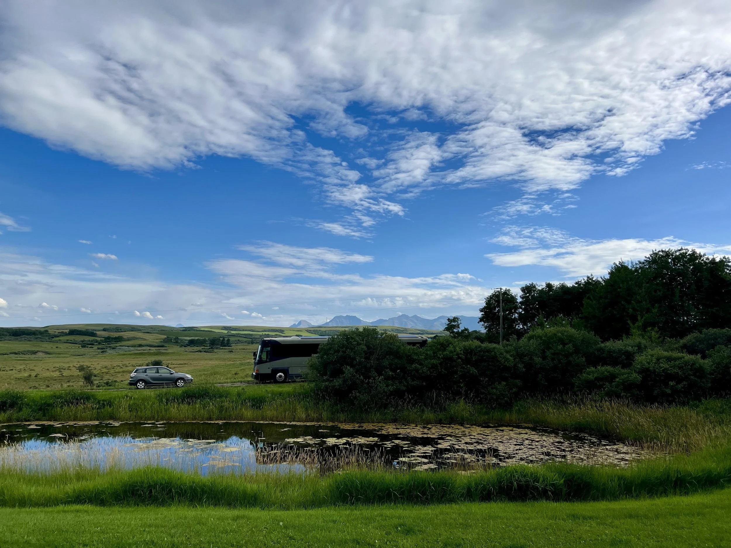 Le matin du 6 août, on prenait la route pour une destination bien attendue : un ranch à Pincher Creek, près de Waterton National Park, dans le sud de l’Alberta. Dès notre arrivée au ranch, notre hôte Pat nous montre où on peut se stationner : un beau spot avec vue sur les montagnes et un étang juste à côté! Au plus grand plaisir d’Anaya, Pat nous montre ensuite leurs chevaux et nous raconte un peu leur histoire. On passera 4 belles journées ici avec nos hôtes Pat et Ken.
