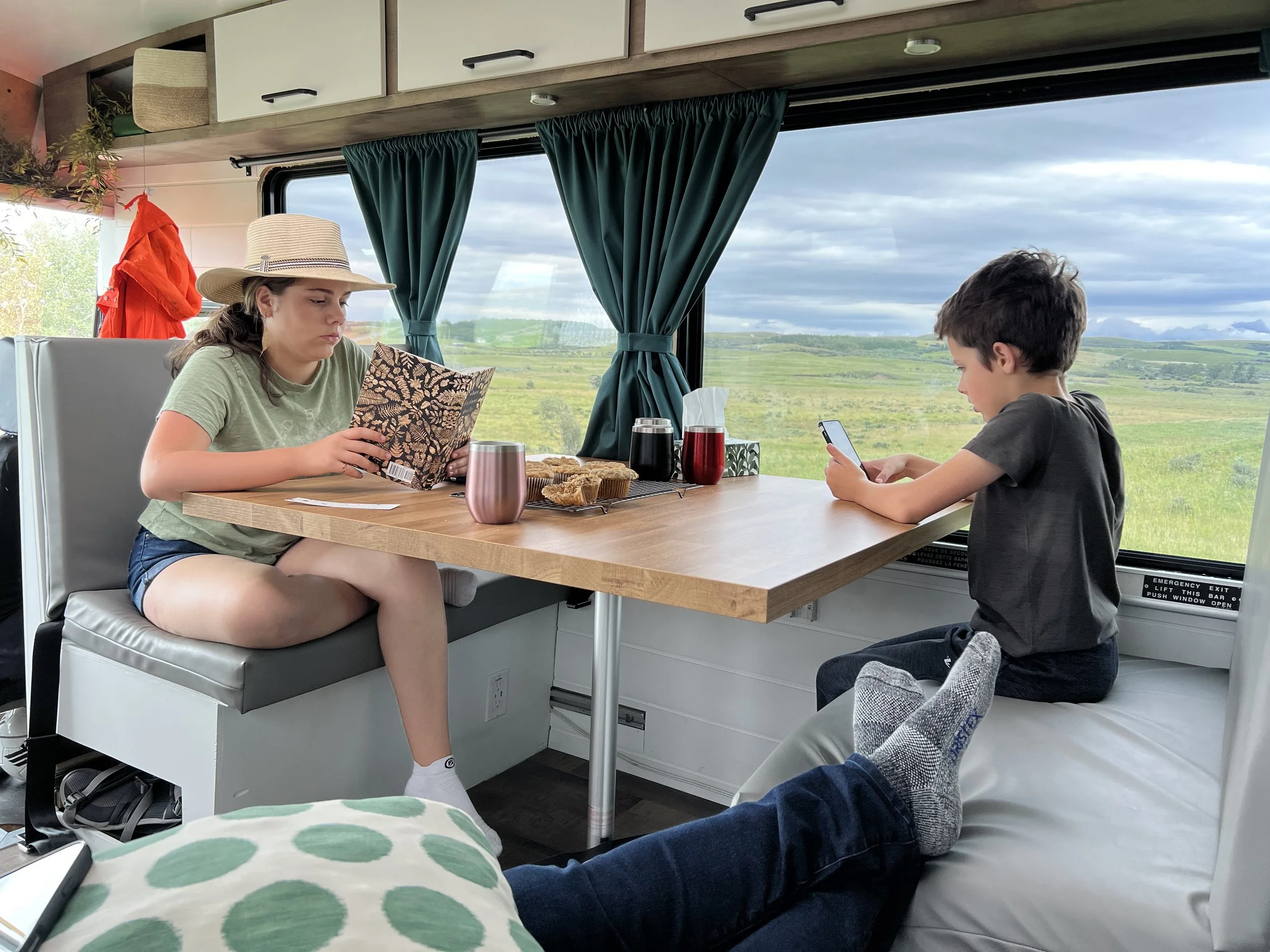 Since the weather that week was on the cooler side, Anaya and I took the chance to bake some muffins. The oven heats up the bus quickly, so we have to coordinate its use with the outside temperature (just one of those little adjustments to life on the road!). It was also laundry day. This time my husband and I went on our own while the kids stayed at the ranch. We grab any chance we can for a mini date—even if it’s just to the laundromat 😂