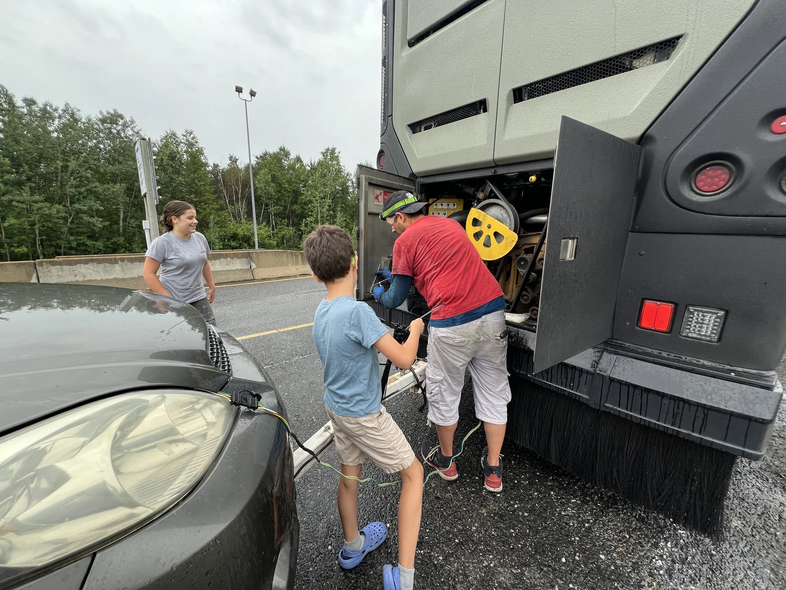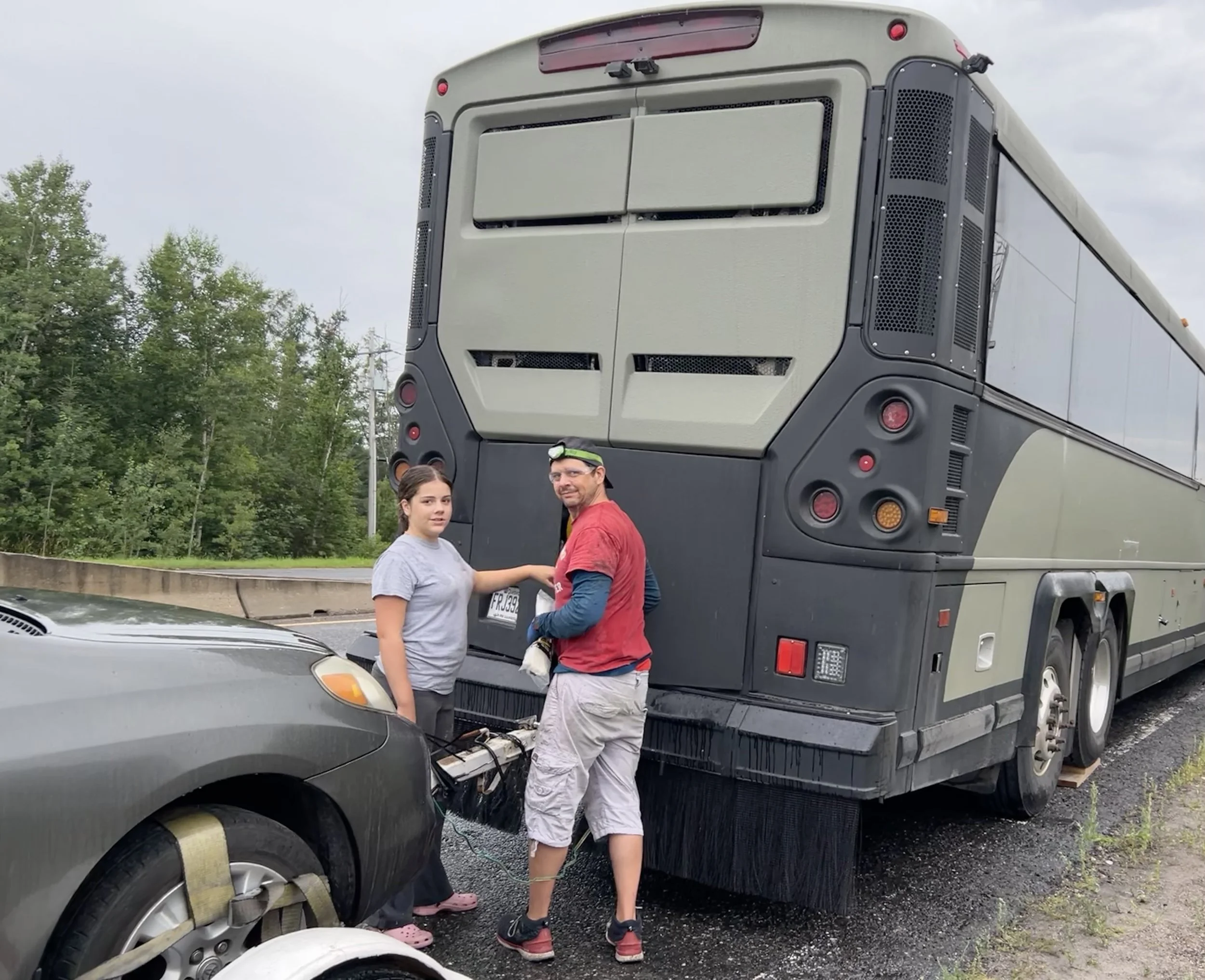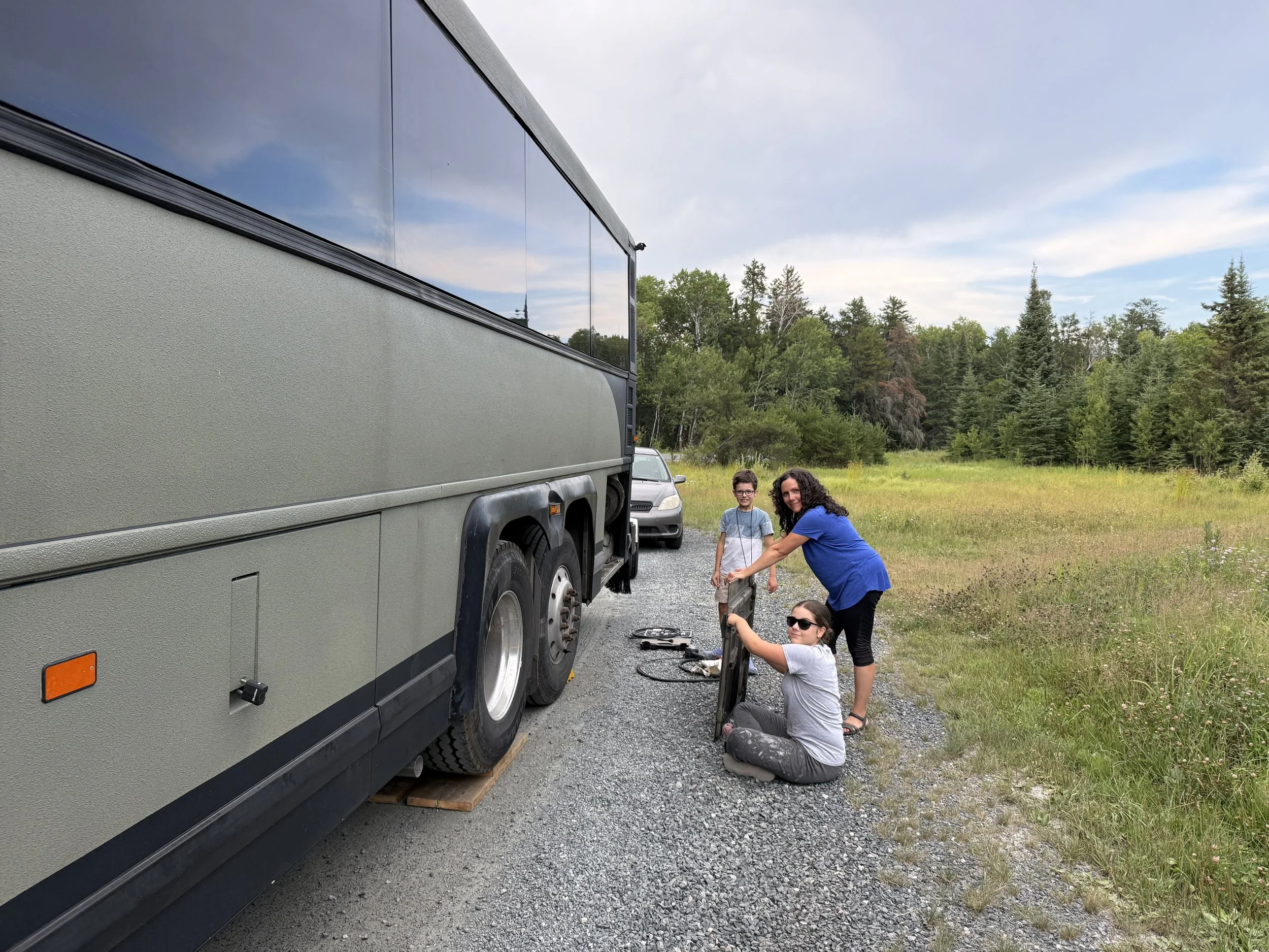That’s when the real roller coaster began. Stress, sweat, and more than a few tears! I’ll spare you every detail and just summarize: On the 700 km drive from Thunder Bay, we planned to do it in one push. But only an hour and a half into the trip, the dashboard let out a loud alarm. We pulled over right away. An air hose was leaking. The only parts store was back in Thunder Bay. So Anaya and I drove three hours round trip to pick up parts—arriving at the store five minutes before closing 😅! Pierre Luc fixed it, but 15 minutes later, another alarm. And so it went…