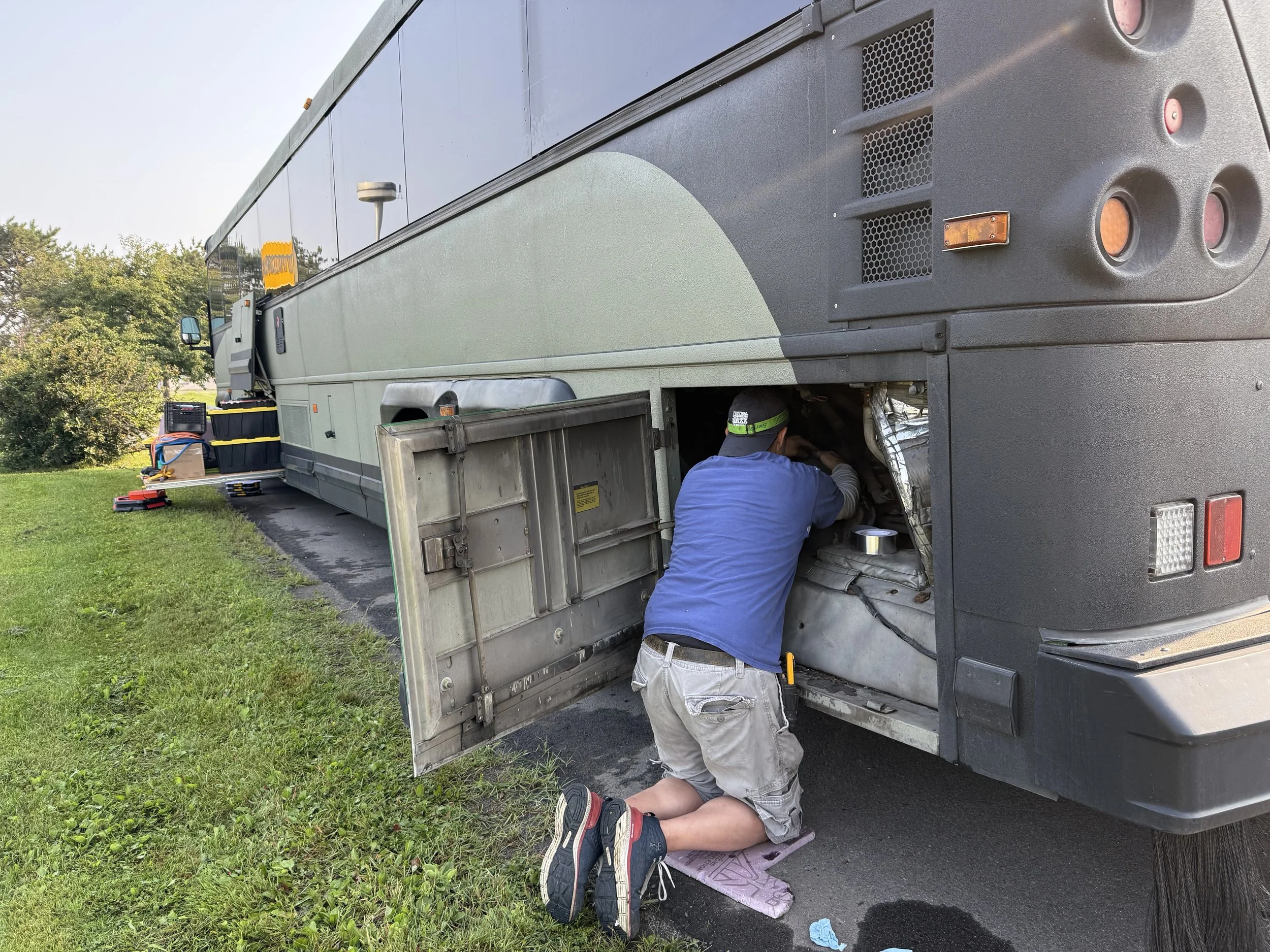 Quelque temps avant d'arriver chez nos hôtes à Thunder Bay, Pierre Luc remarque un centre de services Caterpillar. Il n’y a pas de coïncidence avec Dieu! On a donc pris rdv pour le lendemain, pensant qu’on avait peut-être un problème avec le moteur. Verdict: pas de problème avec notre moteur lui-même, mais l’ordinateur de l’autobus a récemment enregistré un incident au niveau du tuyau d’échappement du moteur. Pierre Luc prend donc le temps de regarder le tuyau pour mieux comprendre ce qui se passe. Pour se faire, il a fallu partiellement ouvrir la gaine qui recouvre le tuyau (et qui sert de barrière pour la chaleur). Il s’aperçoit qu’un morceau du tuyau est en effet craquelé. Il fait une réparation temporaire, le temps de se rendre à Winnipeg où on espère trouver les pièces nécessaires.